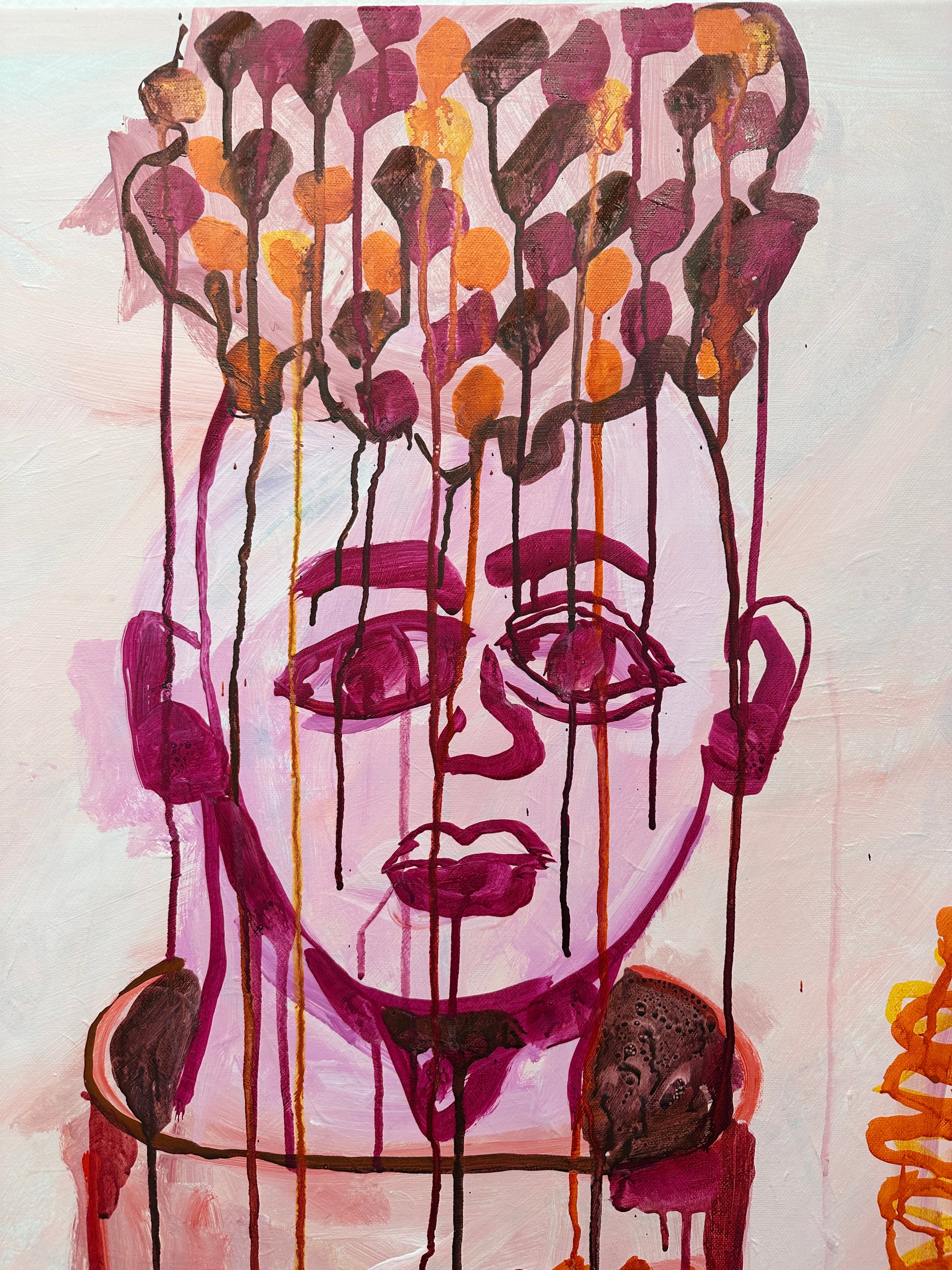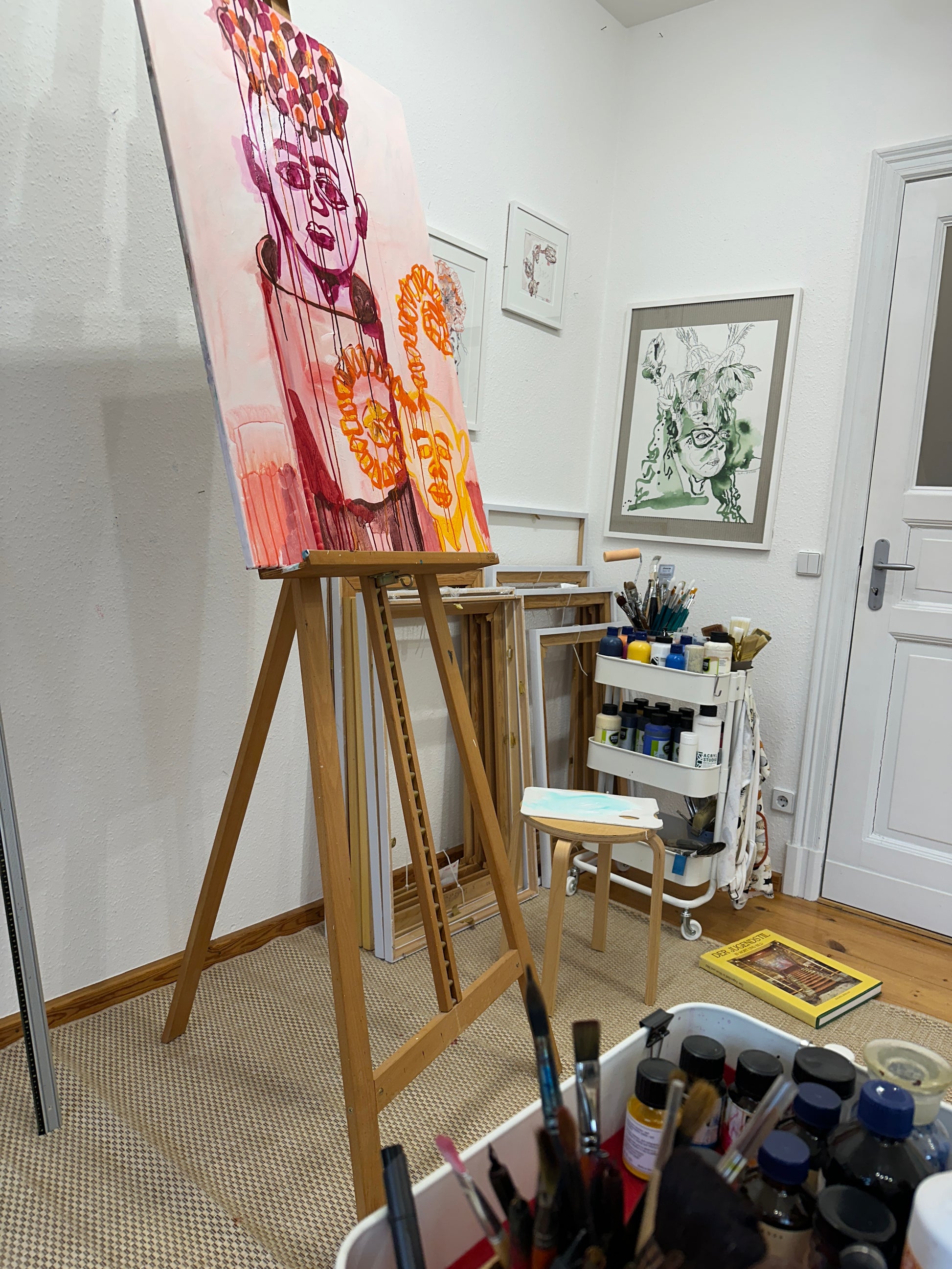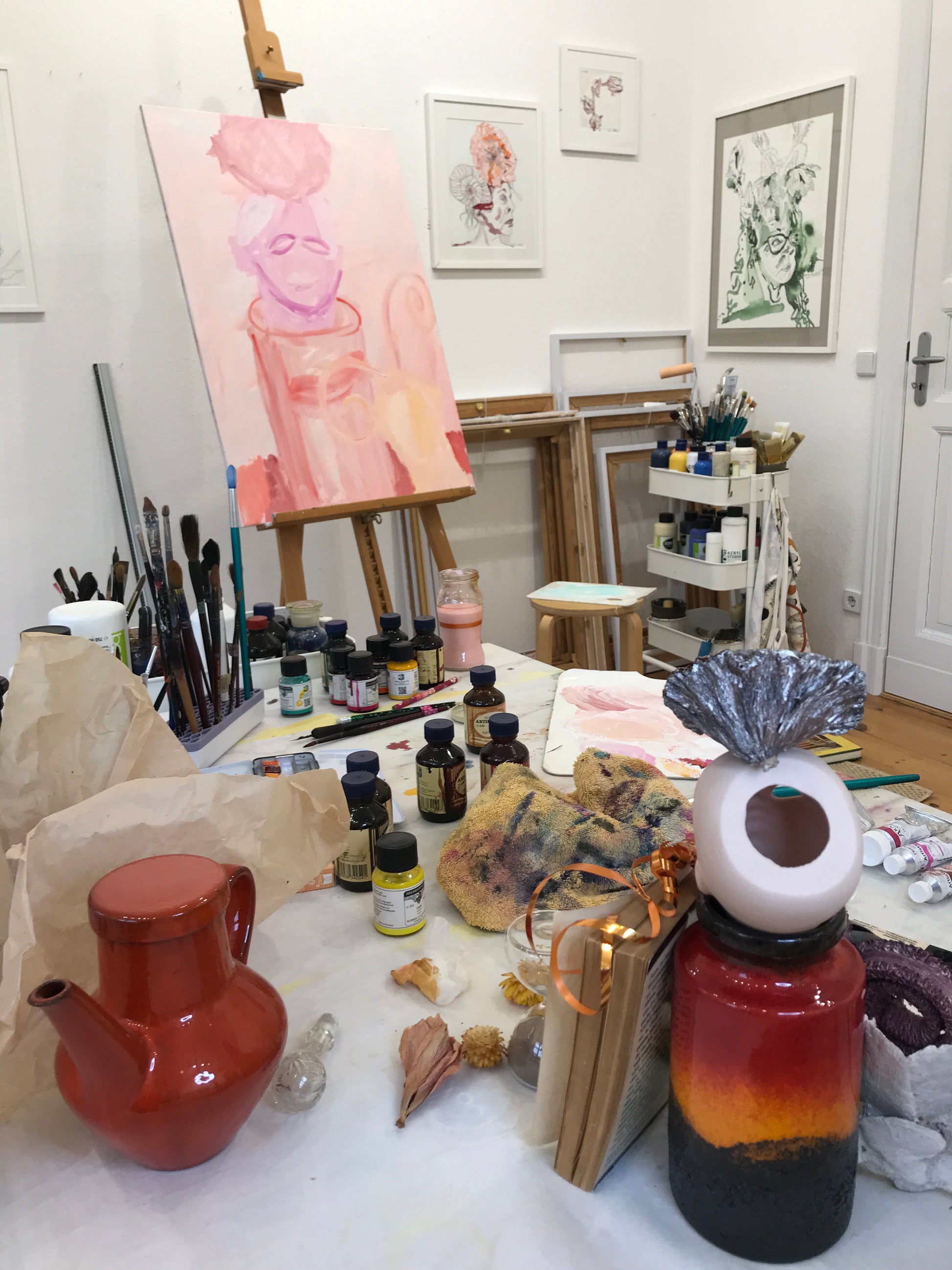 Susanne Haun erzählt in ihren Werken mit Acryl und Tusche auf Leinwand malerische und zeichnerische Geschichten. Auch das Werk Das Lächeln des Widders ist so entstanden. Die Bildidee entwickelte sich aus ihren Stilllebenelementen, die sie immer wieder anders kombiniert und zu neuen Motiven arrangiert.