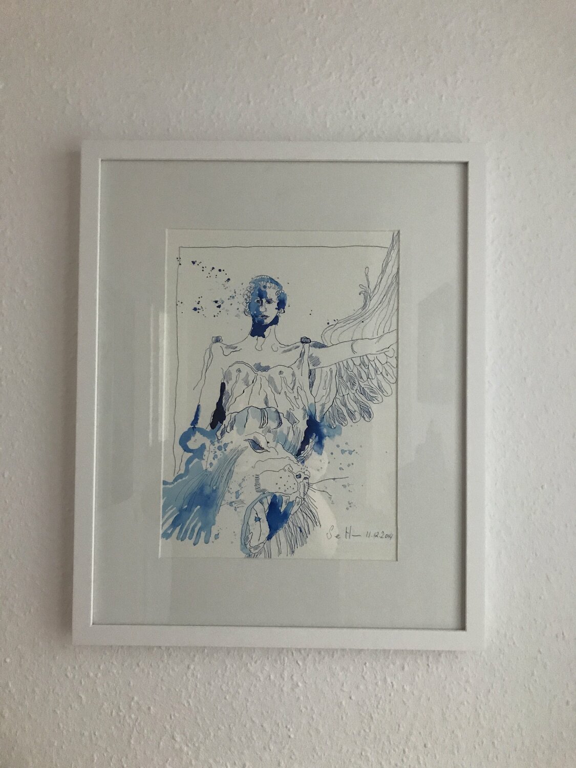 The work is framed under glass with a white wooden frame and passepartout in the size 50 x 40 cm.