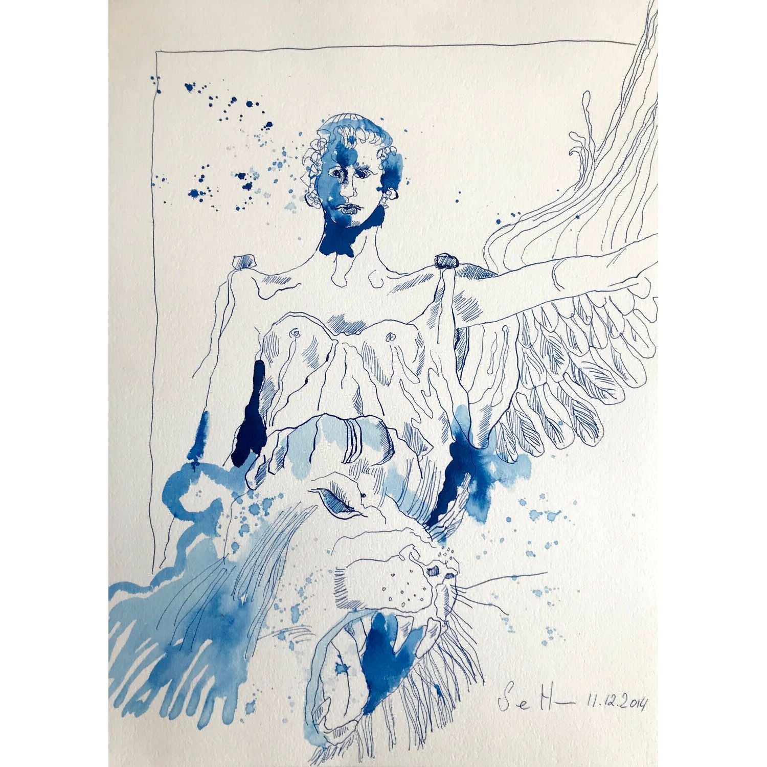 The zodiac sign Leo is protected by an angel. Haun sees angels as beings that stimulate people's imagination and that walk the earth to protect them. The angel depicted here has lost a wing and is in the company of a lion. Is the angel protecting the lion or the lion protecting the angel? That is the question!