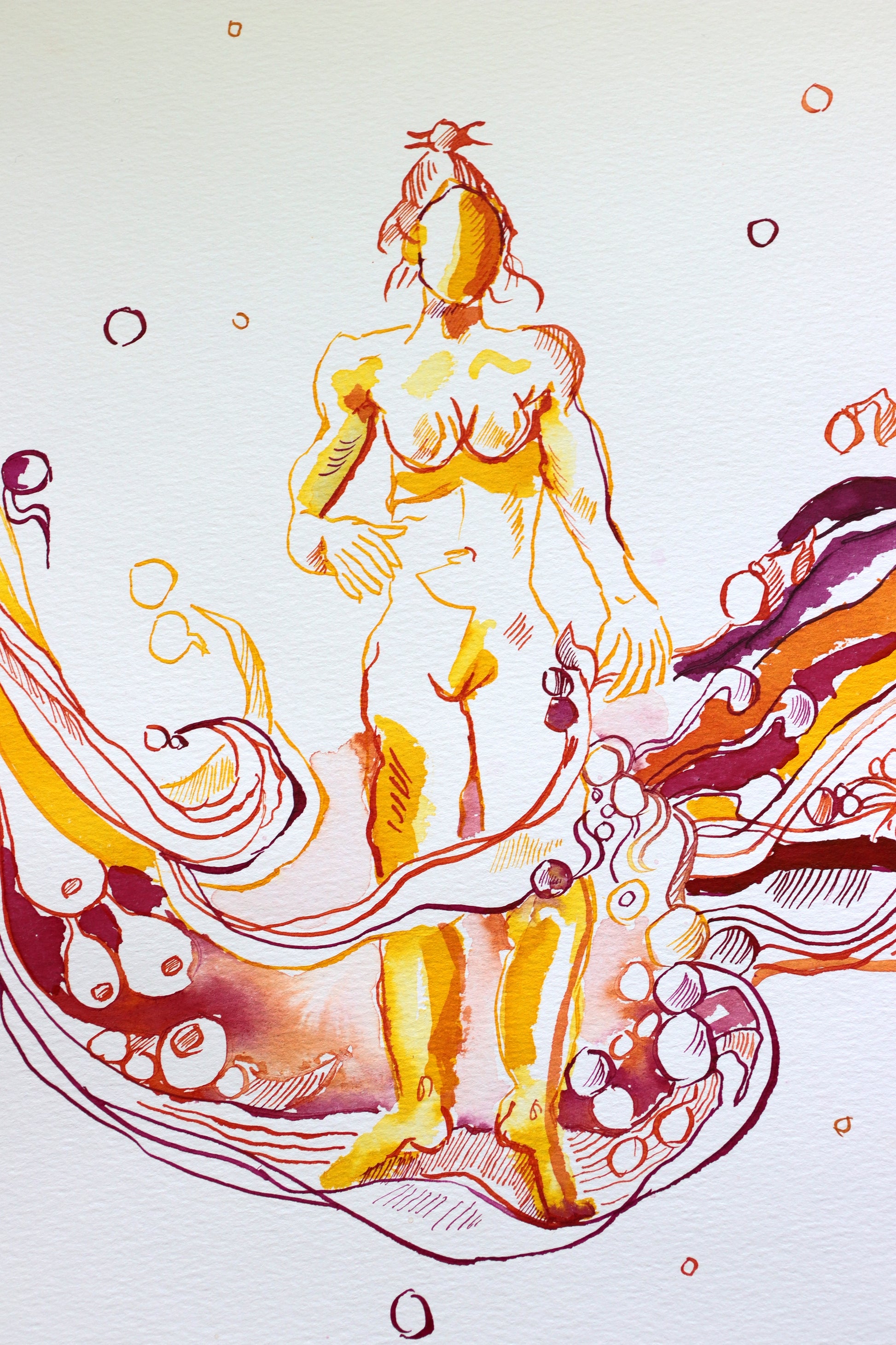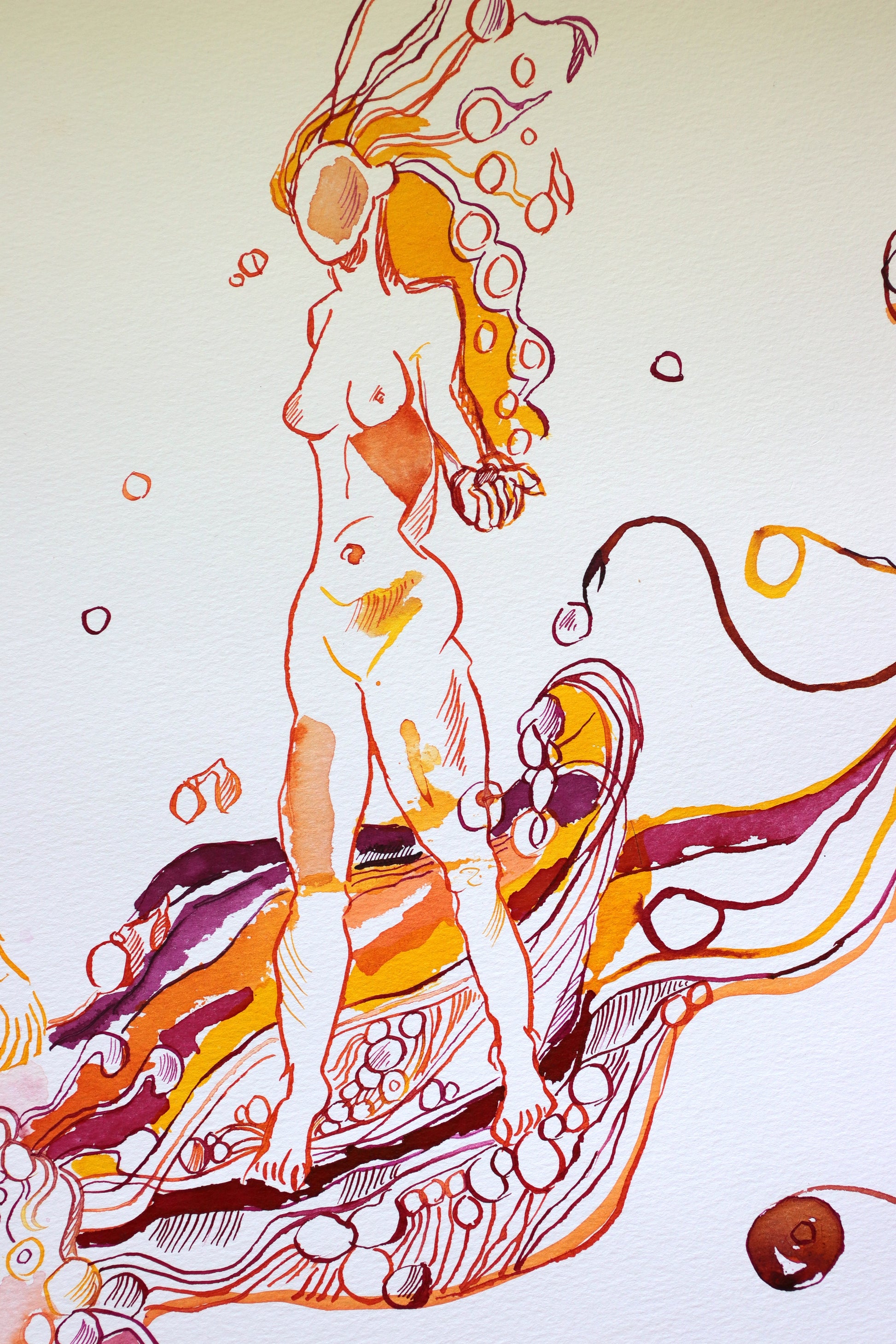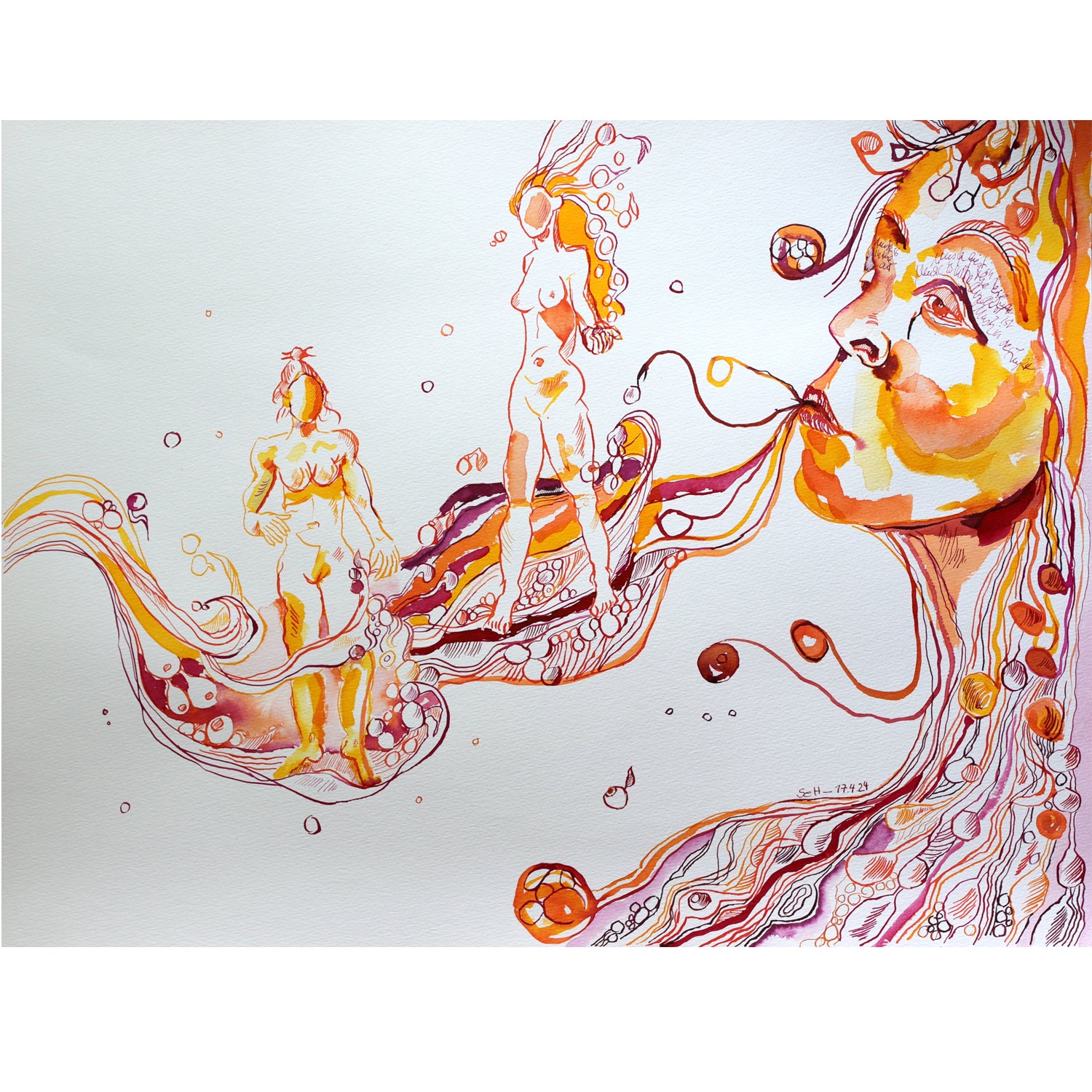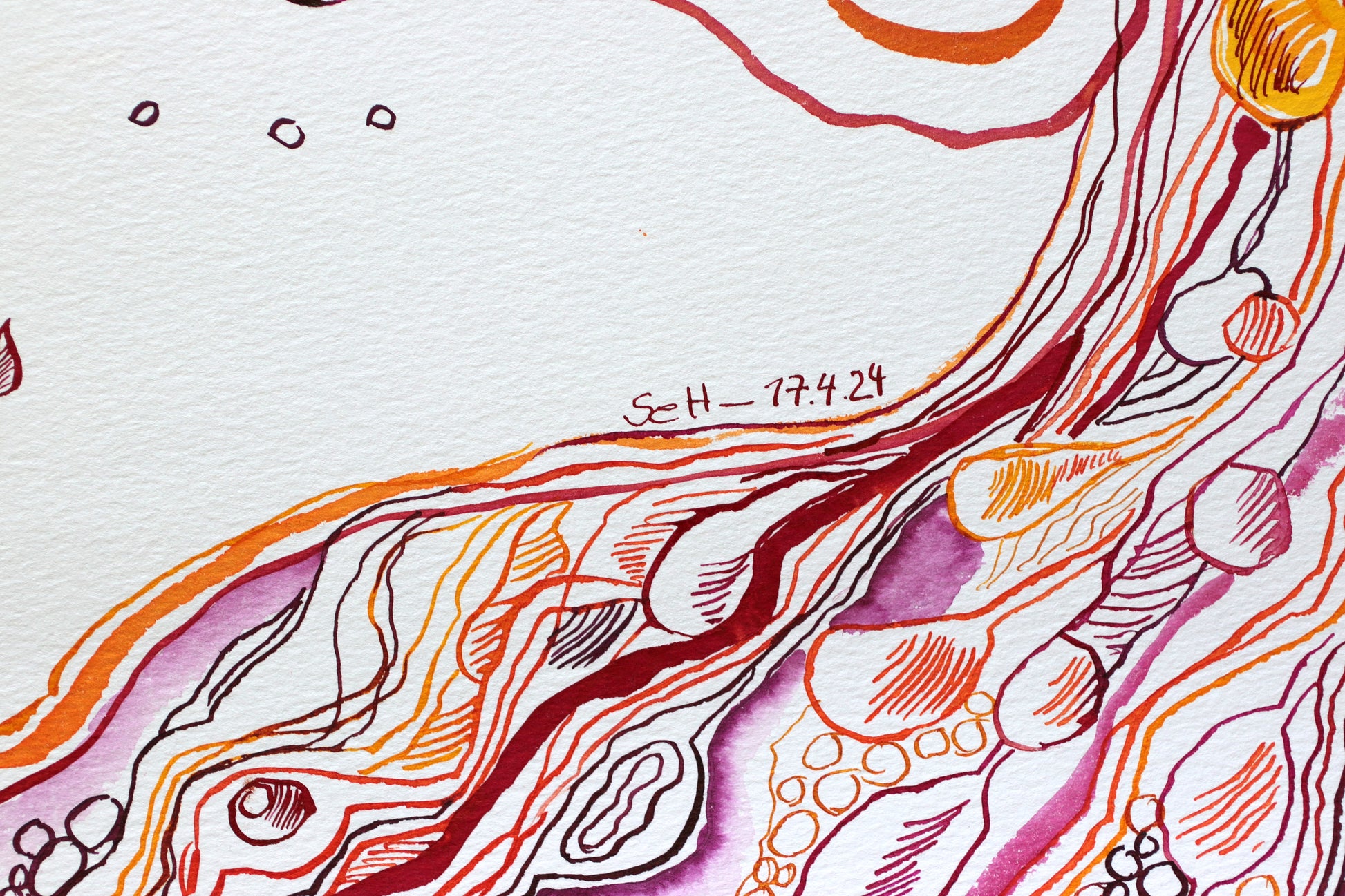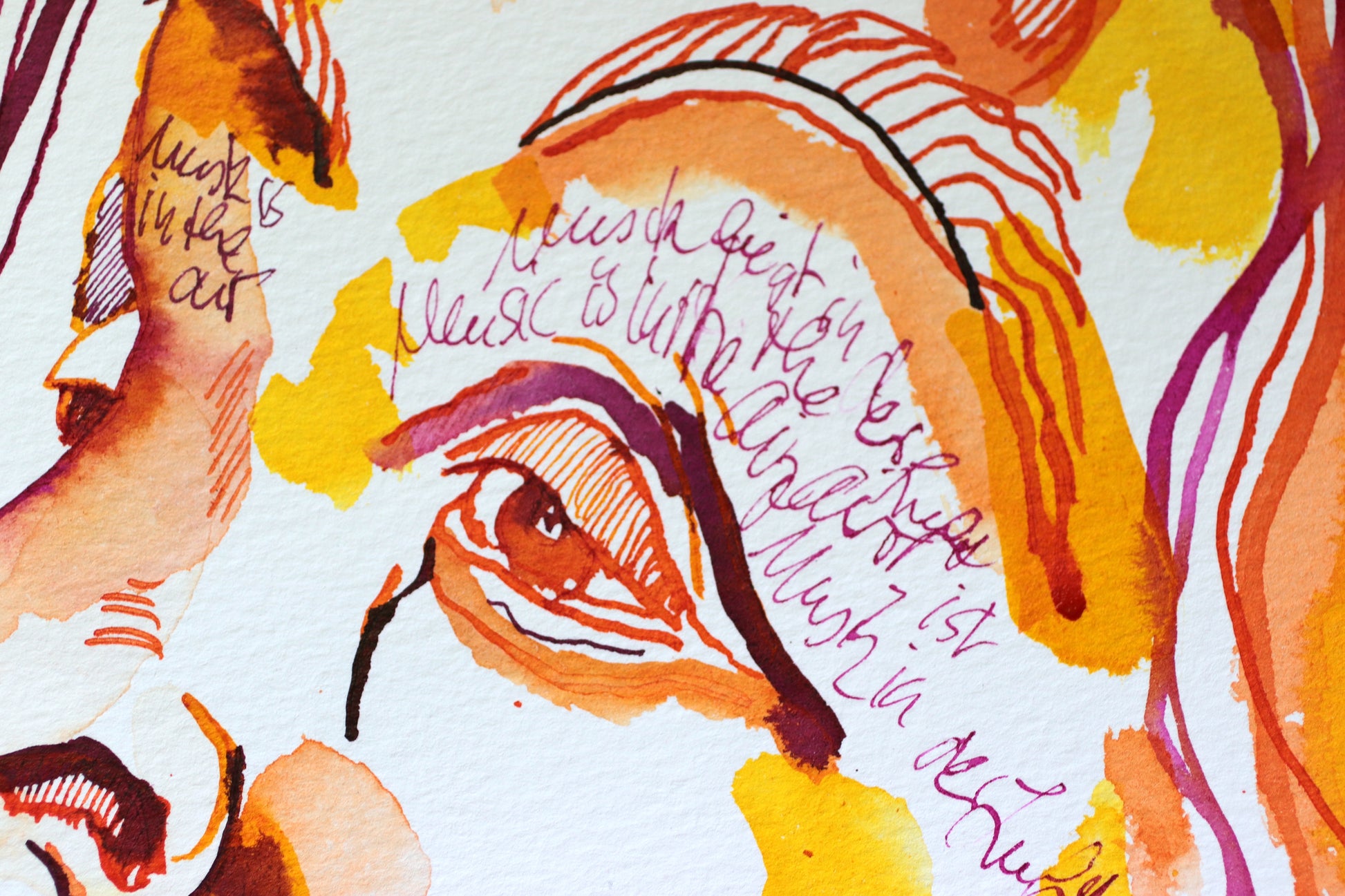 The world dances and sings, because singing and dancing makes you happy. Haun is influenced by the strong colors of the 70s, orange, yellow and red were the favorite colors used for cars, wallpaper and clothing. The sunny colors are associated with warmth, sun and happiness. Notes and dancing sounds flow from the woman's sensual mouth. The eyes are decorated with calligraphy instead of eye shadow. Susanne Haun used this drawing acid-free watercolor cardboard "Veneto", 325 g/m2 with rough front and matt back from Hahnemühle and antique ink from Rohrer.