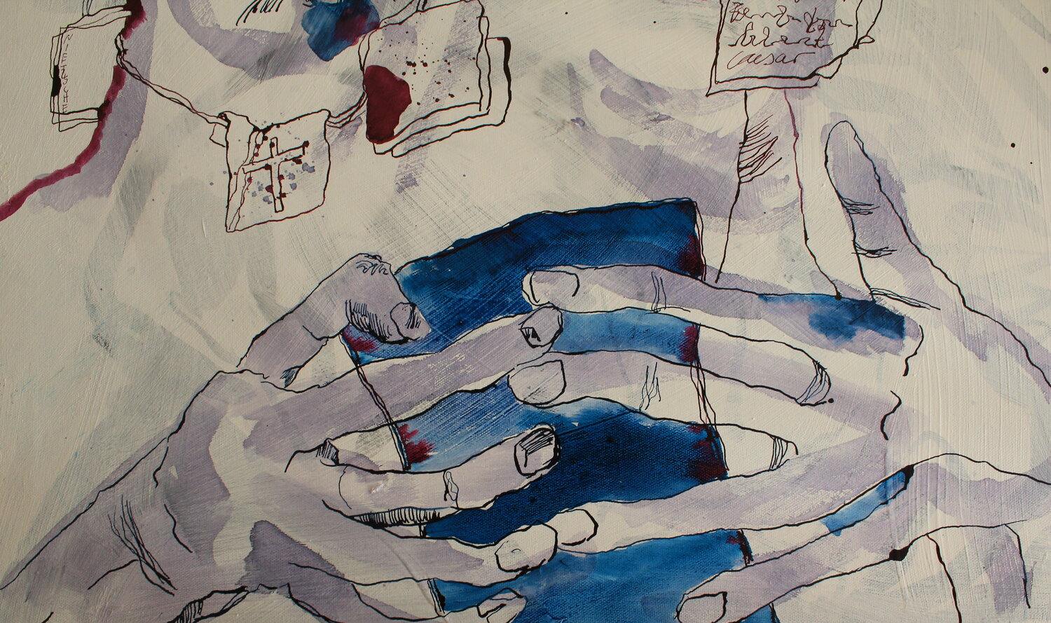 Susanne Haun first drew this event in sketches, then on watercolor cardboard and finally on a canvas measuring 80 x 60 cm for a drawing. In addition to the ink, she used a canvas covered with traces of memory.