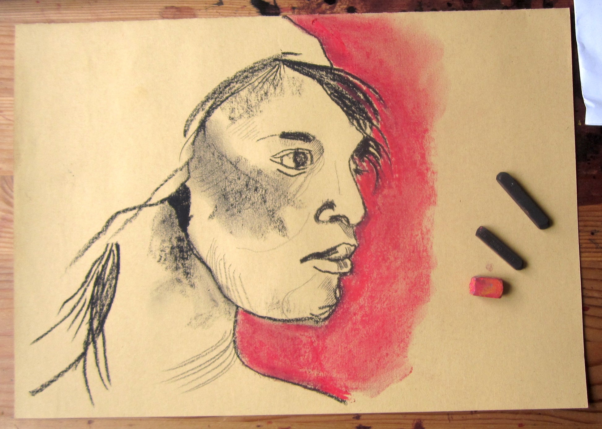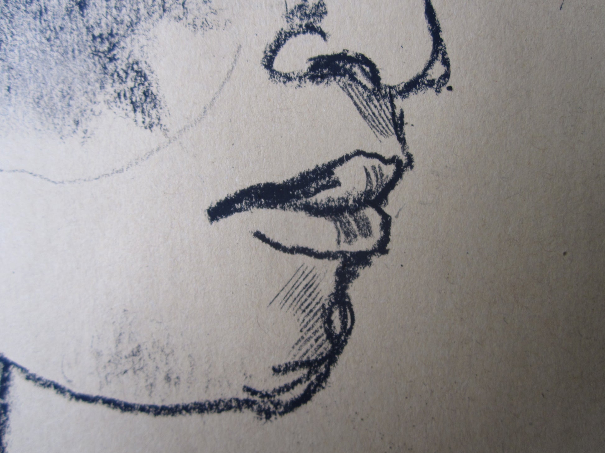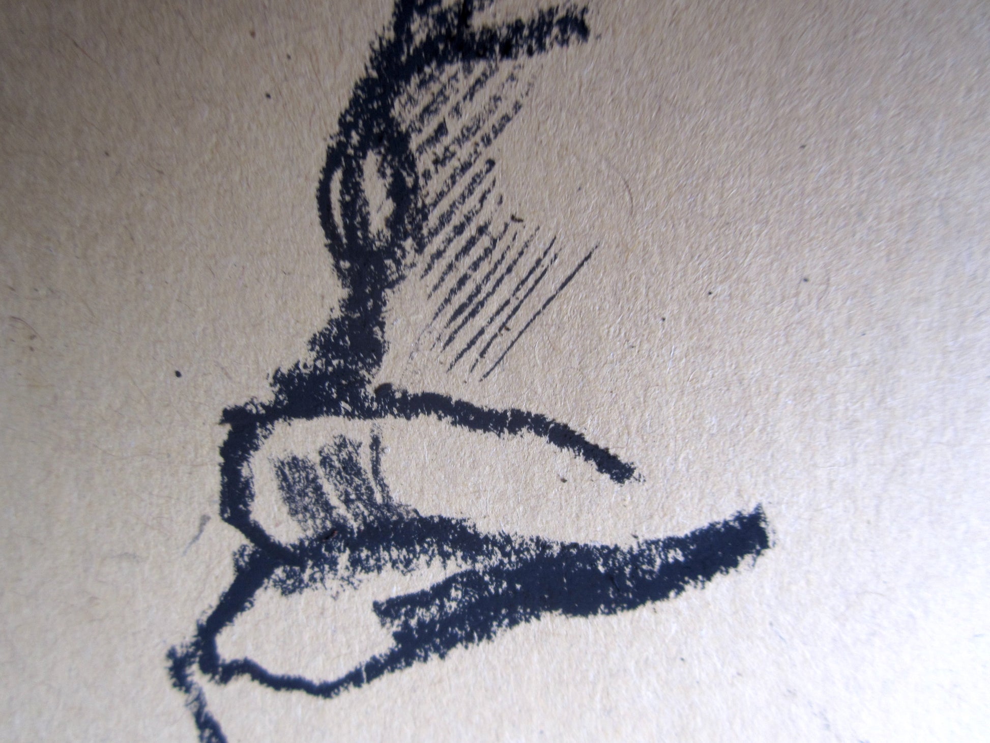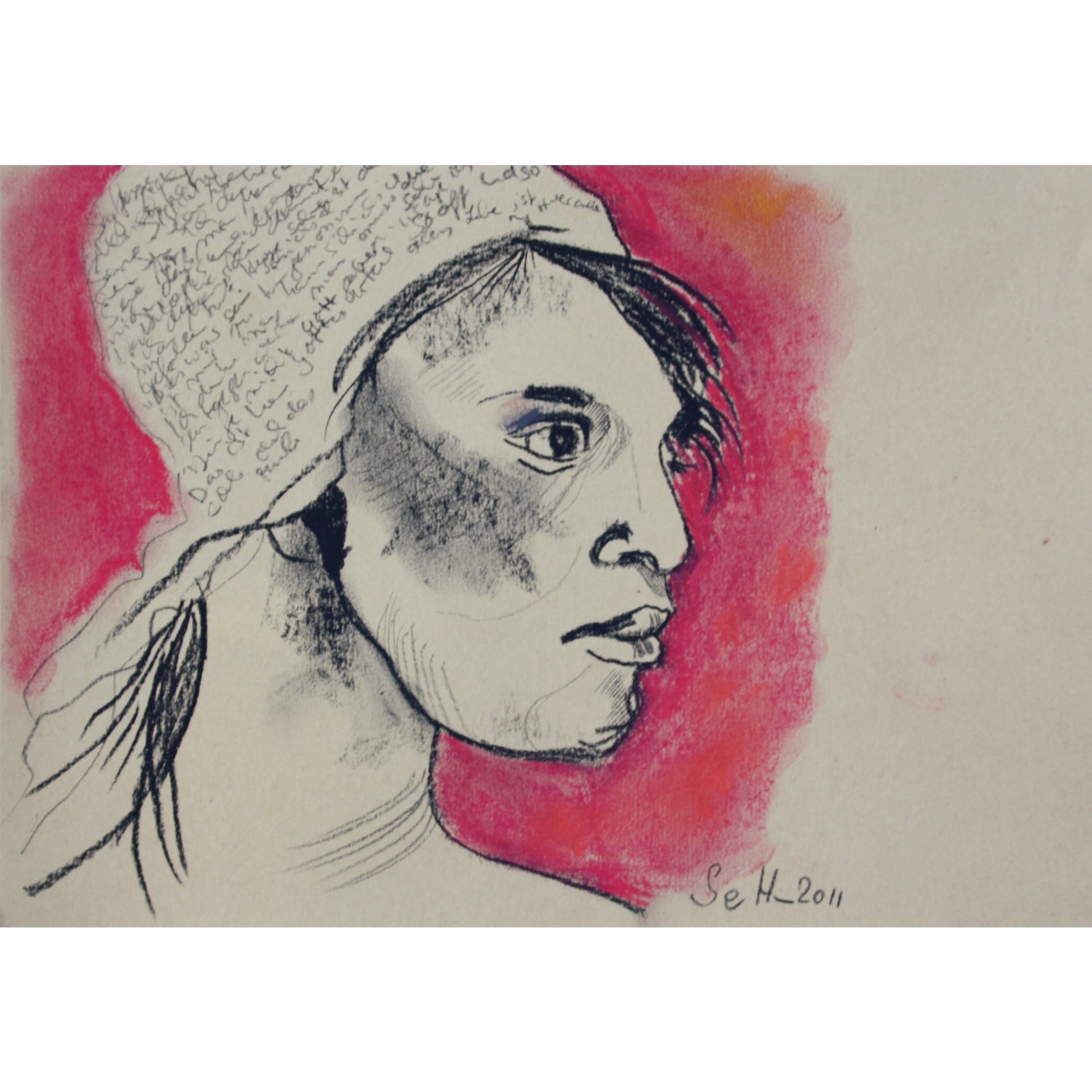 Gibt es wirklich Schicksal? Diese Frage stellte sich Susanne Haun beim Zeichnen dieses Porträts. Fragen und Gedanken kalligrafierte sie in den Hut der jungen Frau, die keine bestimmte Person darstellt. Manchmal können die Betrachter die Buchstaben lesen und manchmal gehen die Worte in geschwungenen Bögen unter. Die Betrachter können die eigenen Gedanken zum Schicksal gedanklich einfließen lassen.