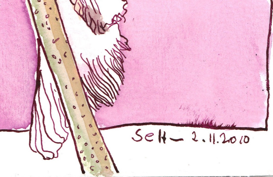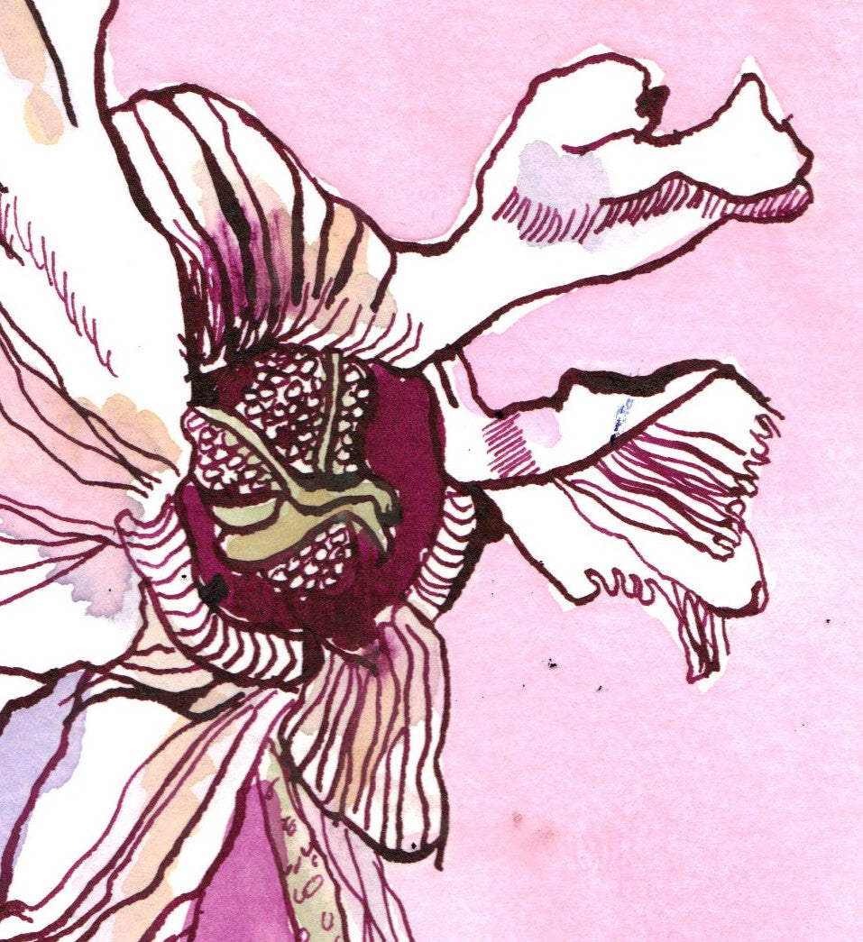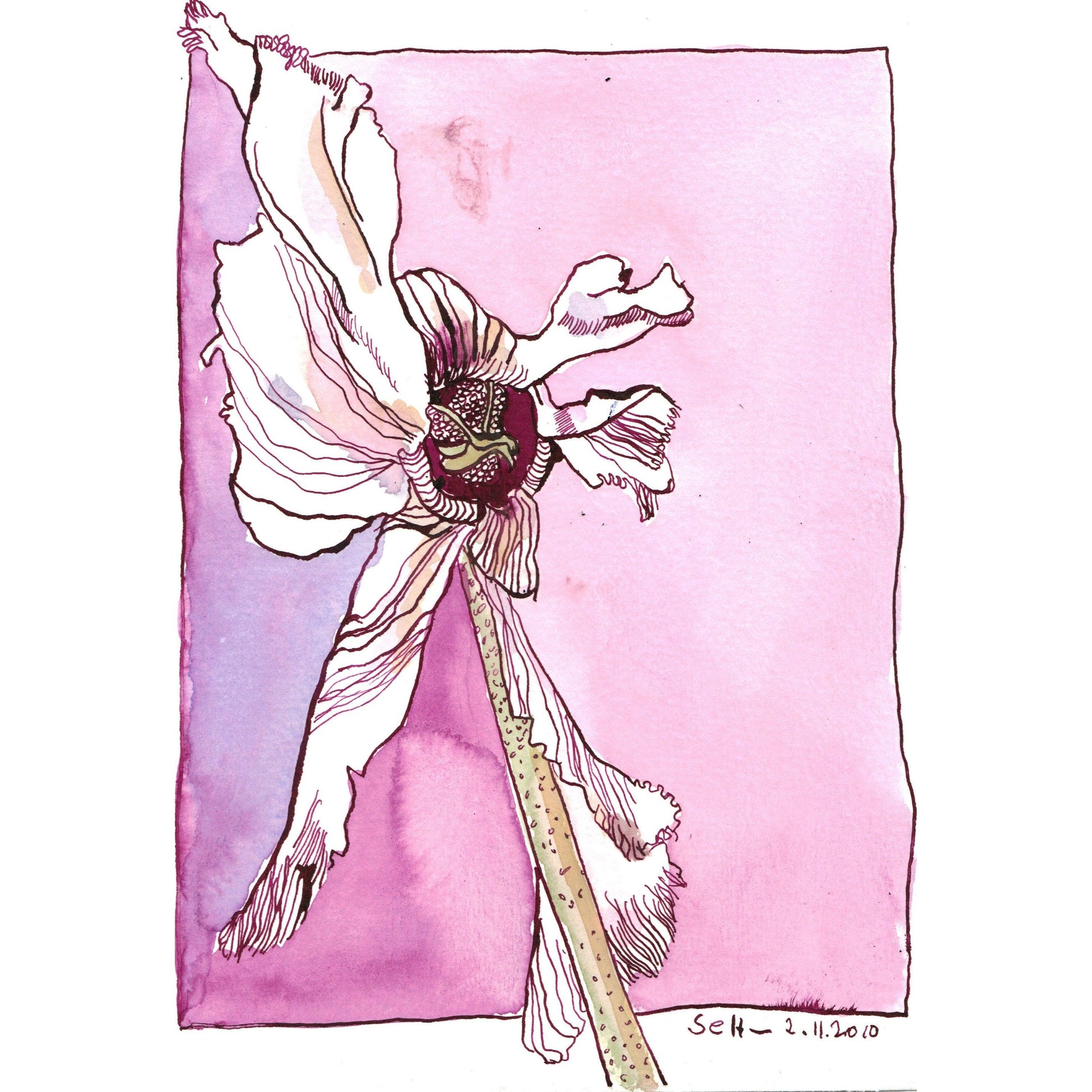 The drawing is made on Hahnemühle Burgundy watercolor cardboard, 250g/m² thick, with Rohrer antique ink.