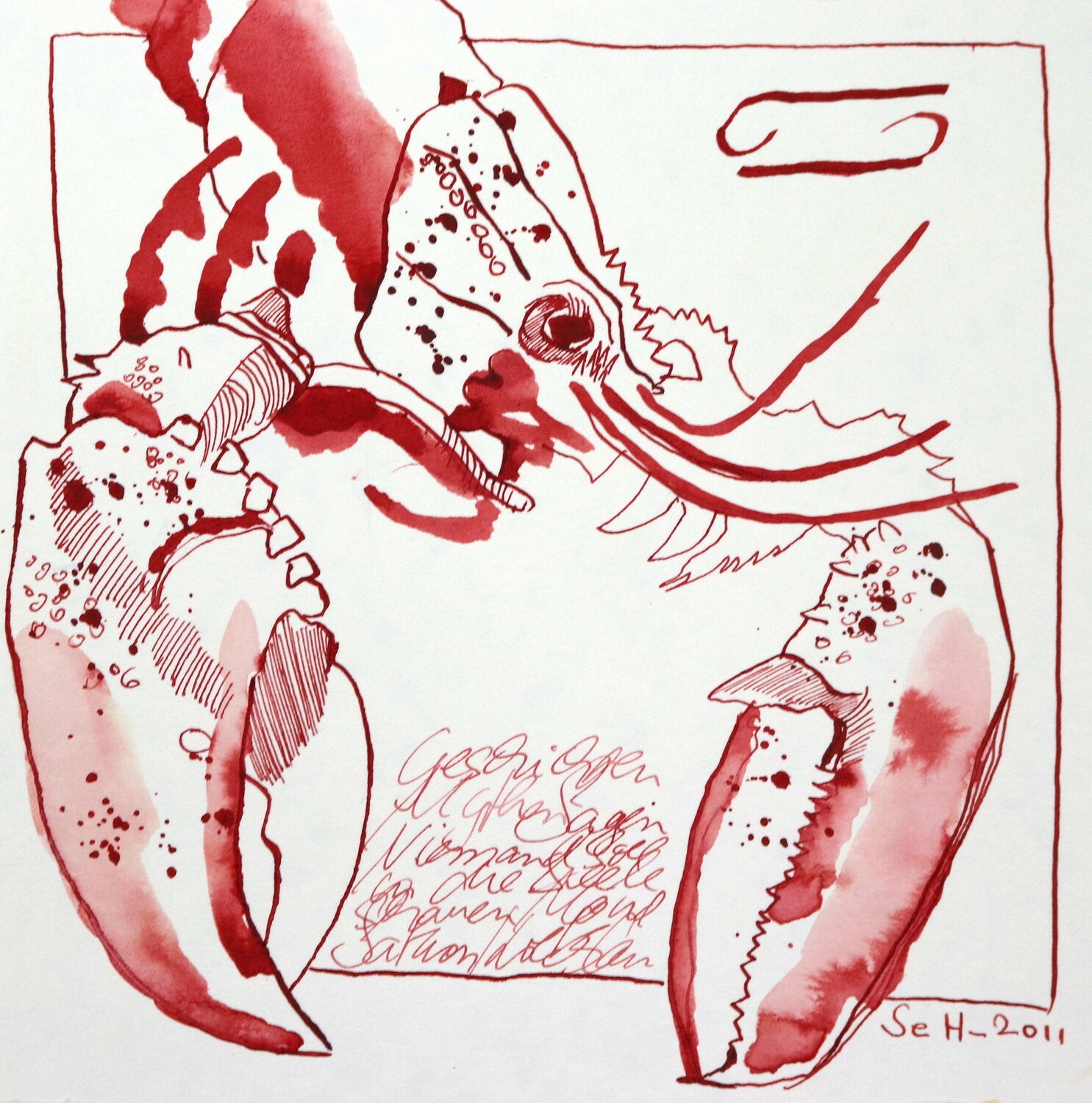 Cancer is emotional and mysterious. That is why Susanne Haun uses blood red color. One of the bad characteristics of Cancer is that he/she is very possessive. The symbol of the zodiac sign is calligraphed in the upper part of the picture and the characteristics of Cancer are calligraphed in the lower part.