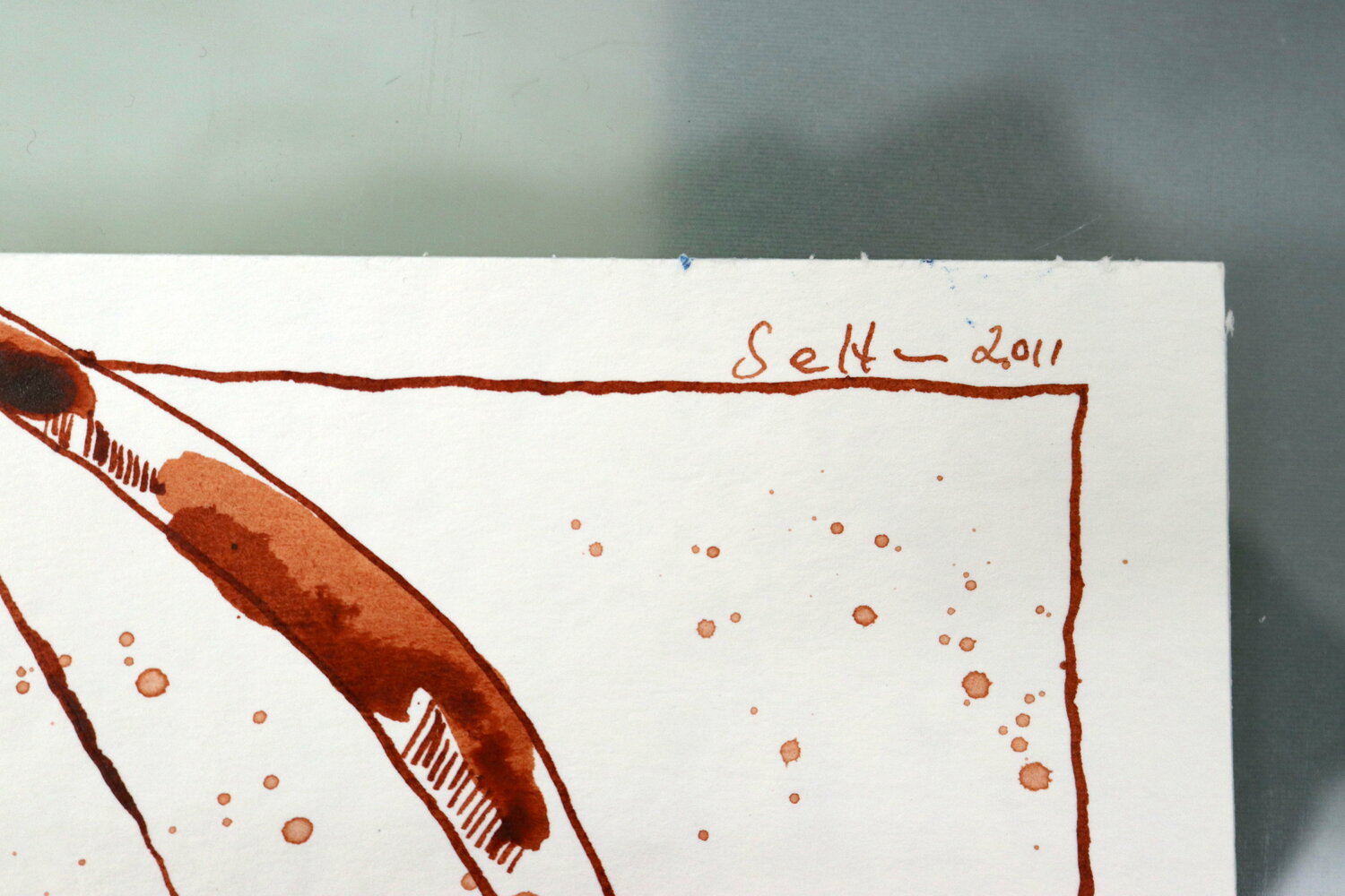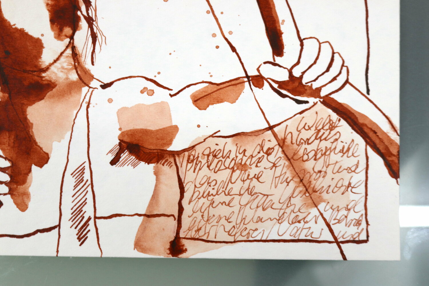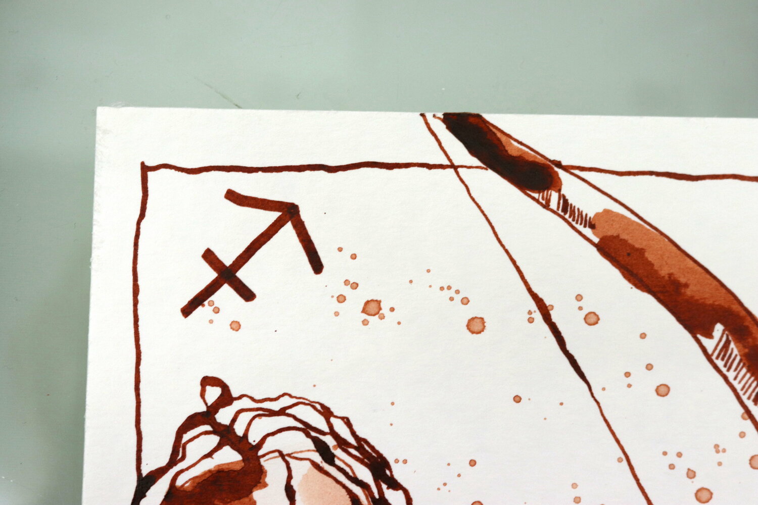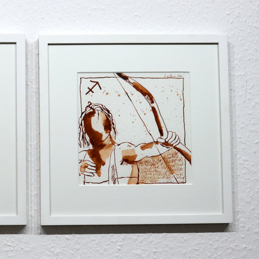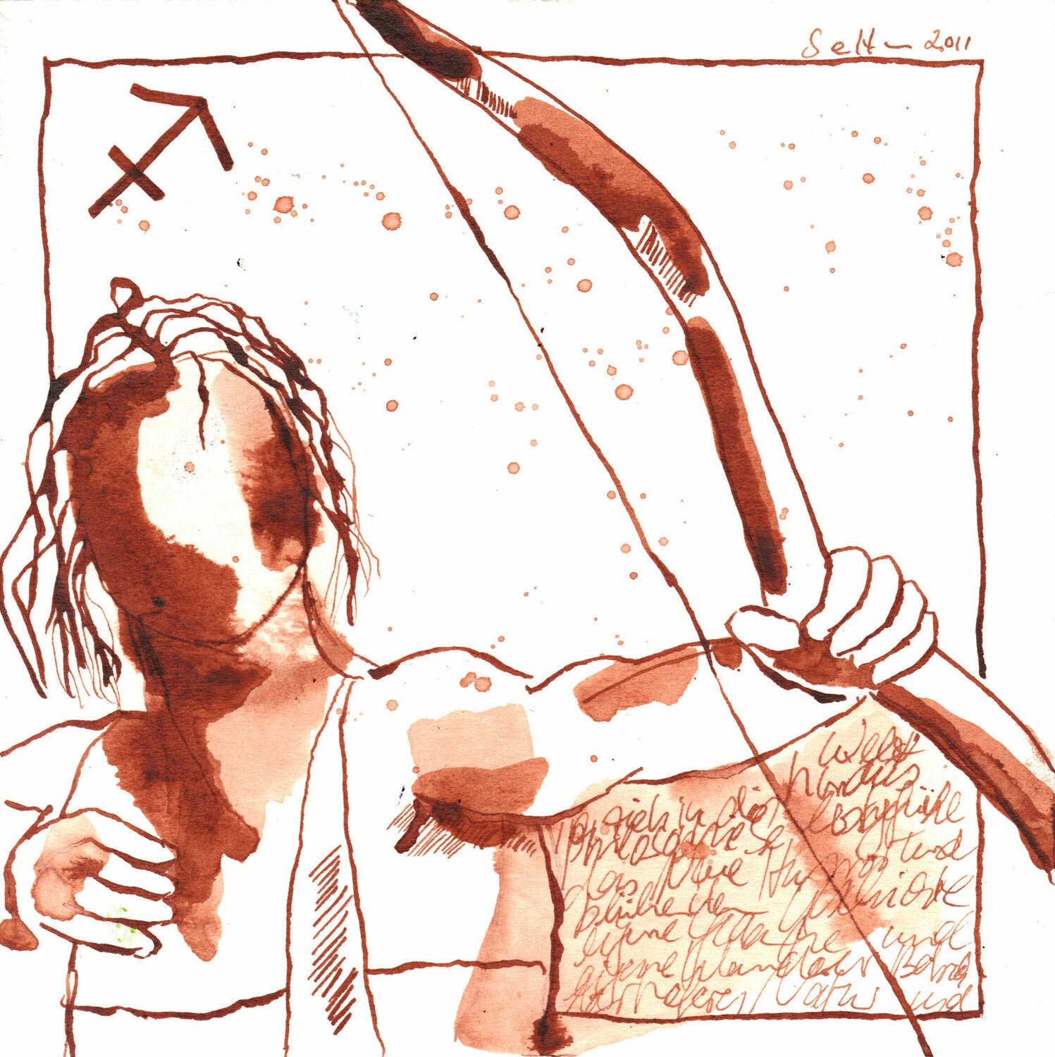 Susanne Haun found warm ochre ink to be suitable for the zodiac sign Sagittarius. Sagittarius is optimistic, adventurous and honest. Haun's drawing shows Sagittarius's power to draw the bow. The symbol of the zodiac sign and Sagittarius' characteristics are calligraphed in the upper part of the picture.