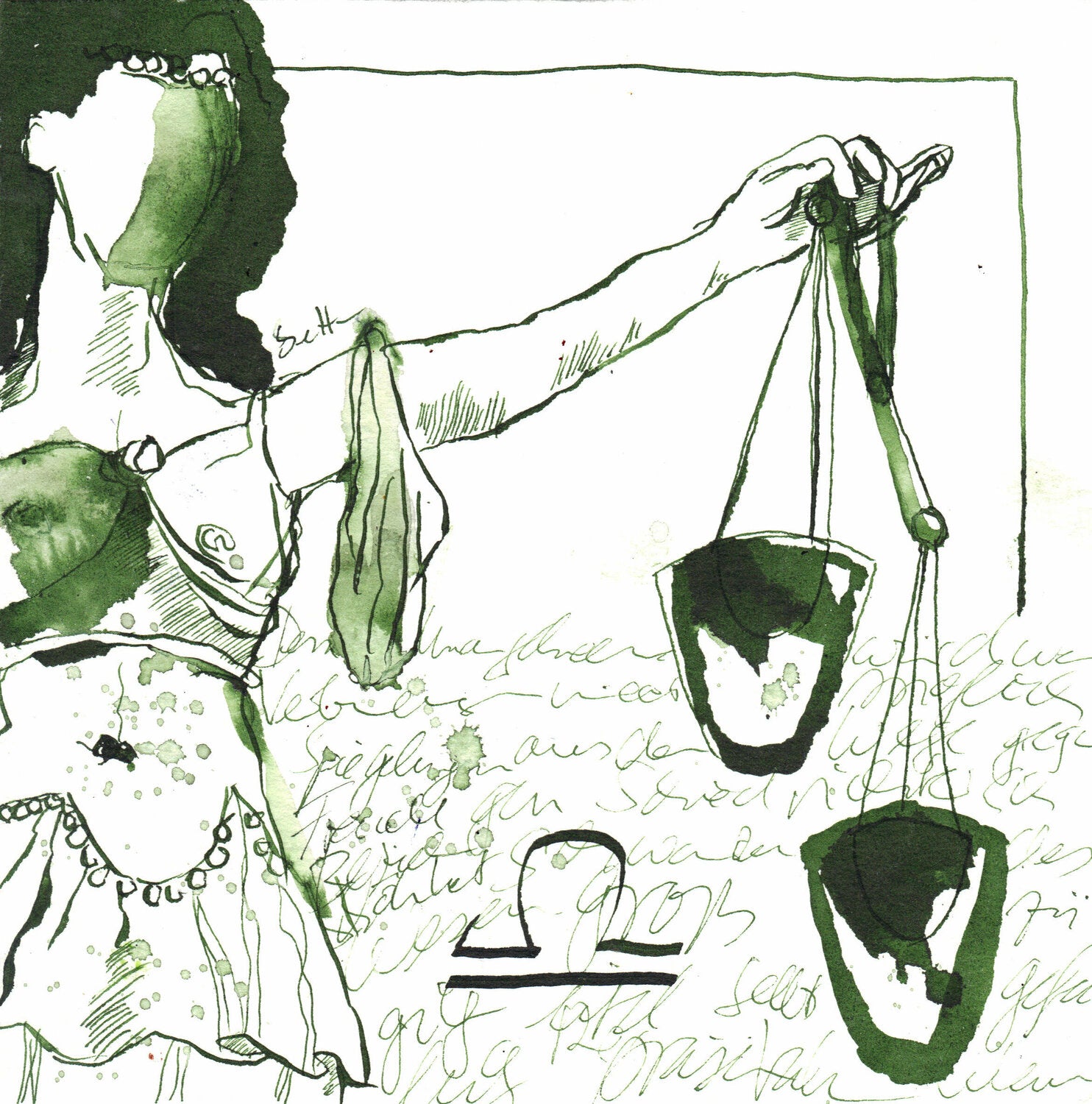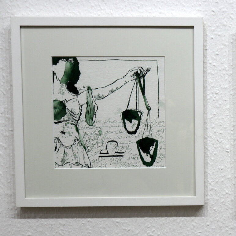 In this picture she has chosen the scales. Susanne Haun sees the scales as something balancing, she depicts them as a woman who is wearing a bare midriff. The symbol of the zodiac sign and the characteristics of the scales are calligraphed in the lower part of the picture.