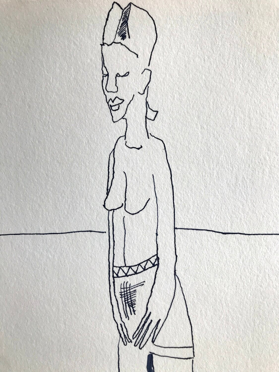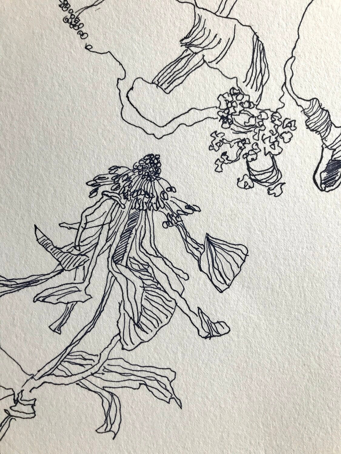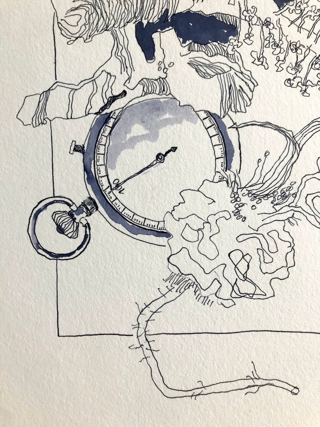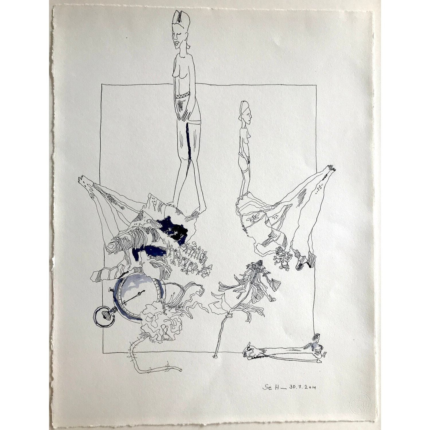 Eine Taschenuhr, die Susanne Haun von ihrer Oma erbte, inspirierte die Künstlerin zu diesem Vanitas Stillleben in Indigo. Die emotionale Bindung zum Original ist noch nie so wichtig gewesen wie im Zeitalter digitaler Bilderflut. Nicht nur die Uhr sondern auch der dargestellte verblühte Hibiskus ist direkt mit der Zeichnerin verbunden. Die Blüten stammen aus dem Garten ihrer Eltern, die Mutter ist schon Tod und auch der Vater wohnt nicht mehr im Haus mit Garten. Die Knochen stammen vom letzten halben Huhn, dass Haun beim Imbiss an der Ecke kaufte und verspeiste. Die Knochen landeten zur Reinigung in die Geschirrspüle und danach als Modell ins Bild. Die Figur ist einer afrikanischen Figur empfunden, die die Künstlerin beim Flohmarkt kaufte.