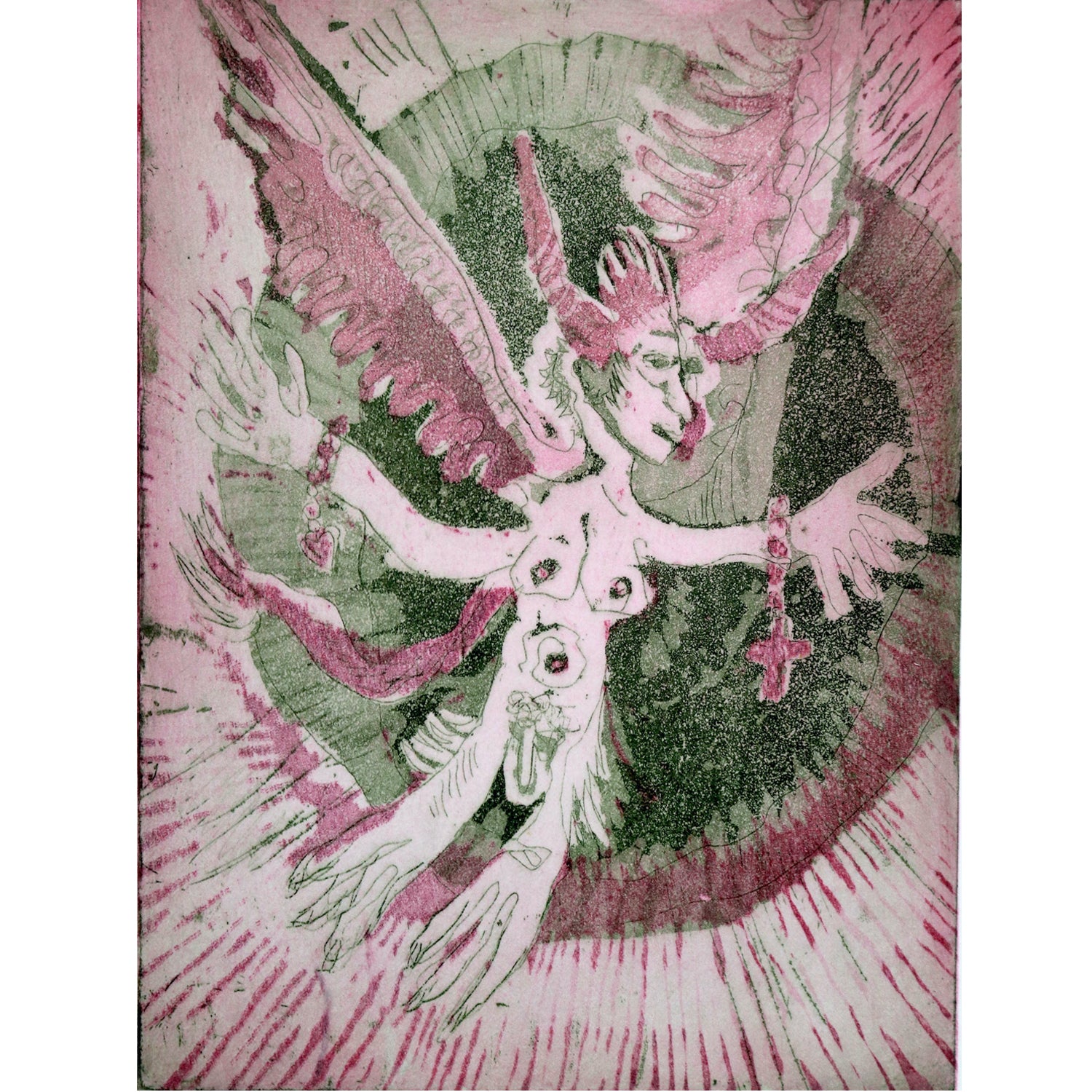 Jede Künstlerin schöpft aus einem Erfahrungsschatz, den sie abruft, der manchmal selbstständig in die Kunstwerke einfließen.Bei Susanne Haun gehören Flügel und Hörner zu diesem Schatz genau wie Perlenketten und Kreuze. Runde Formen (dazu gehört auch der Busen), Bewegung und Farbe gehören ebenso zum Bildwerk von Haun.