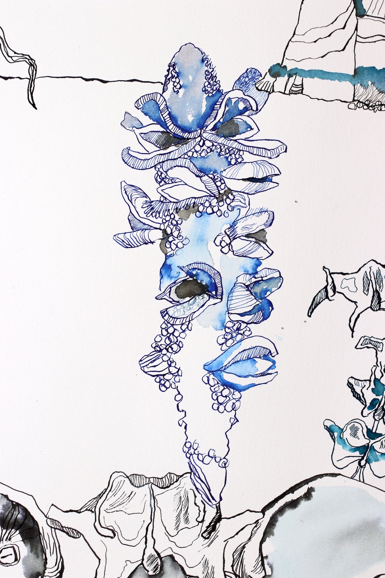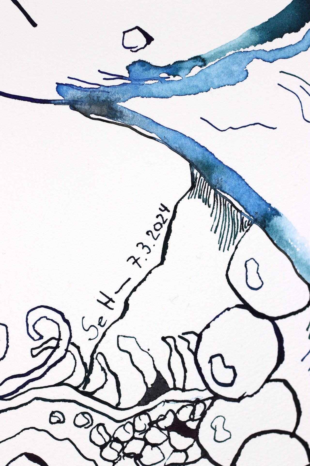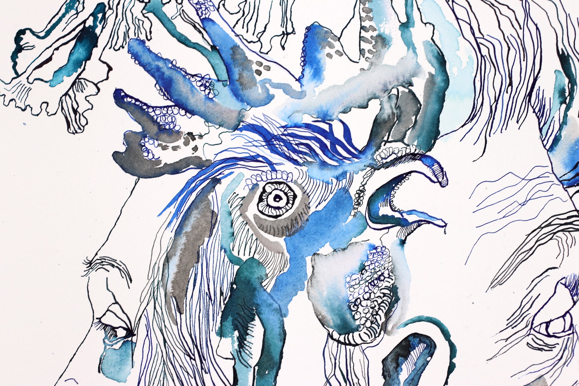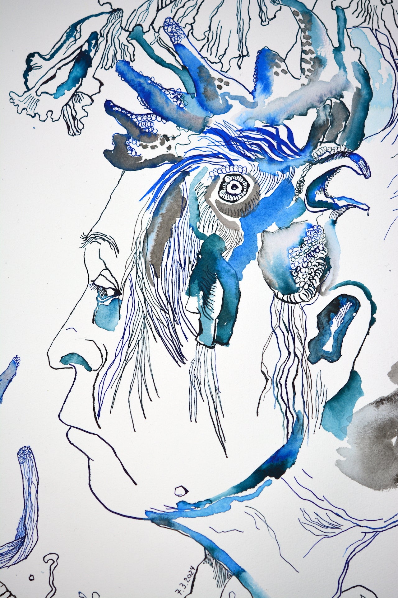 In ihrem Werk erforscht Susanne Haun das Zusammenspiel von Leben und Vergänglichkeit mit lebhaften und poetischen Tuschelinien. Es ist eine Reise durch das Surreale und Symbolische, wo Figuren und Elemente in einer metaphysischen Komposition verschmelzen. Tiefgehende Emotionen und Reflexionen des Seins fließen hier zusammen und laden den Betrachter ein, über unsere Existenz und das, was darüber hinausgeht, nachzudenken: Die Welt und der Mensch verändern sich. Von der Blüte der Jugend bis zum Alter scheint das Leben durch unsere Finger zu verrinnen. Der Spiegel zeigt uns unbarmherzig die Veränderungen an unserem Körper. Eben schauen wir mit der Dynamik der Jugend und im nächsten Augenblick mit der Weisheit des Alters in die Landschaft. Haun stellt diese Veränderungen unbarmherzig mit Tuscheliinien auf handgeschöpften Büttenpapier von Hahnemühle dar. Als Modell hat Haun ihr eigenes Gesicht verwendet.