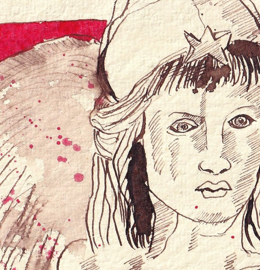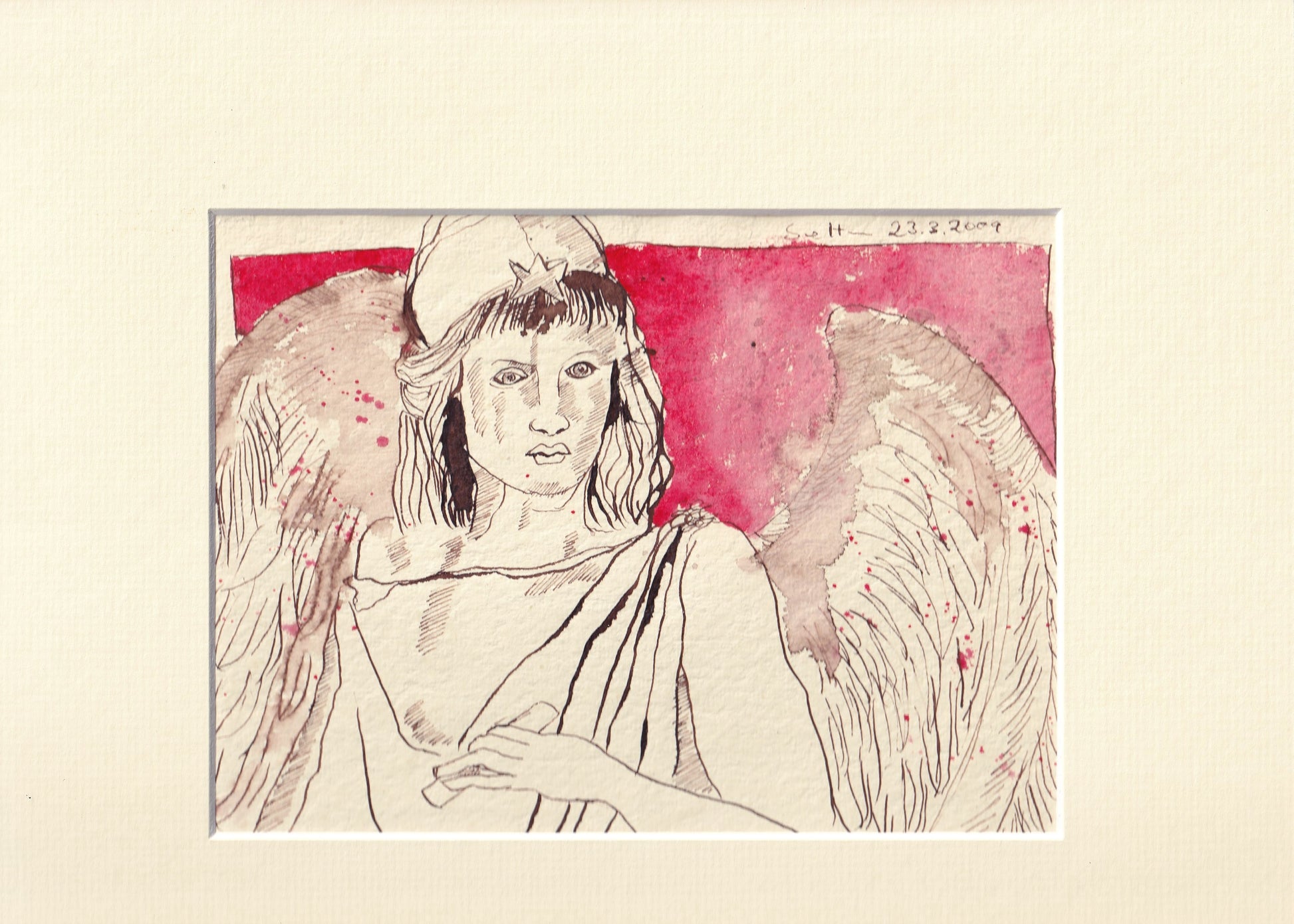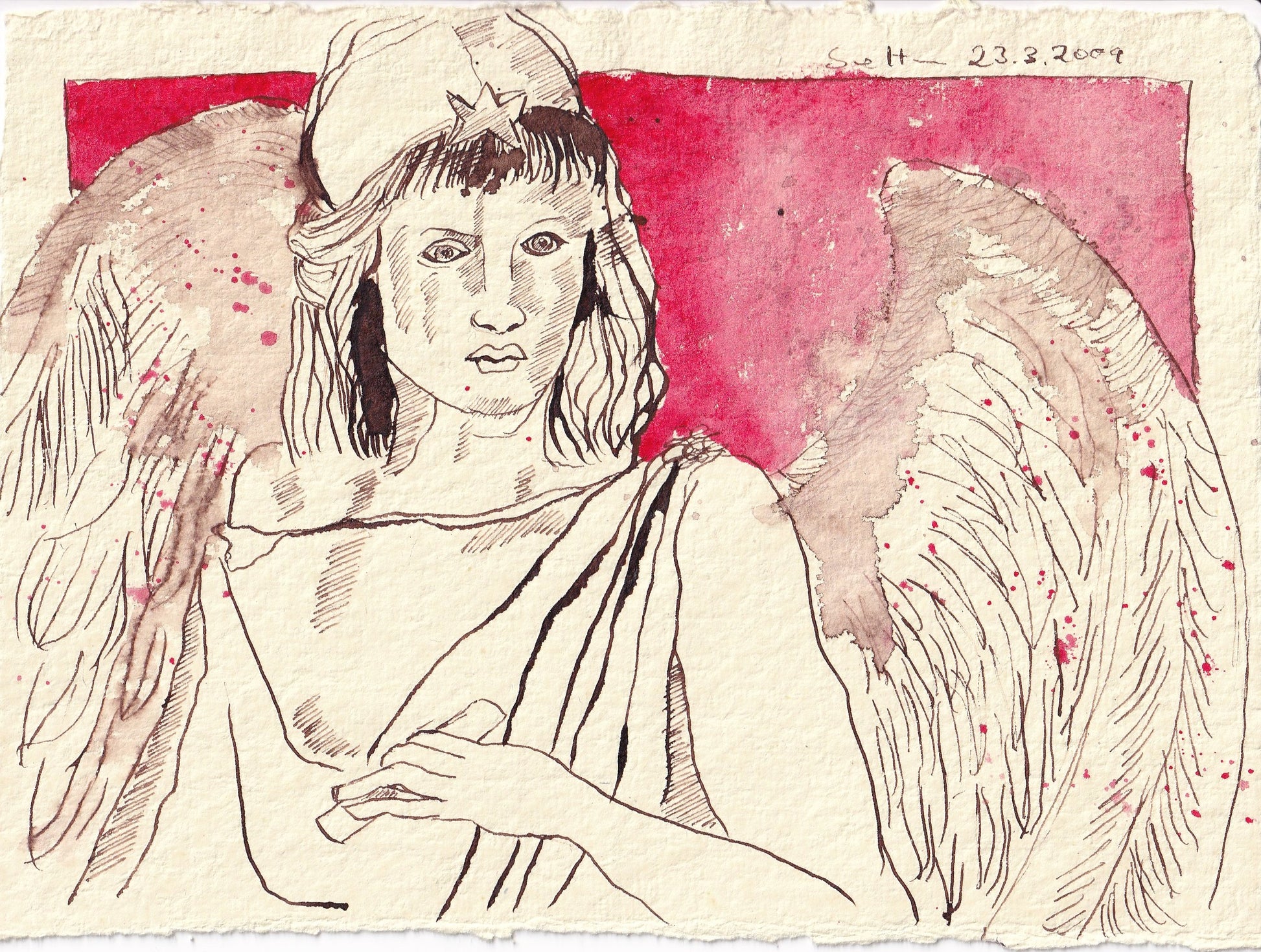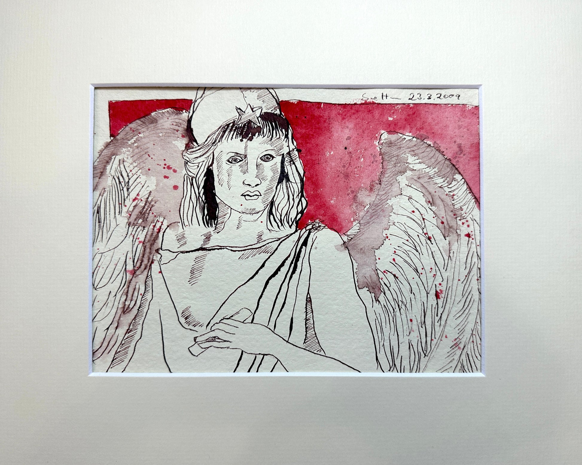 Die Darstellung der Mythologie der Engel ist ein immer wiederkehrendes Thema in den Zeichnungen von Susanne Haun. In ihrer Fantasie gibt es Engel, die Sterne im Haar tragen. Der rote Hintergrund sowie der rote Staub auf den Flügeln des Engels zeigt die Emotionalität der Engel im allgemeinen.