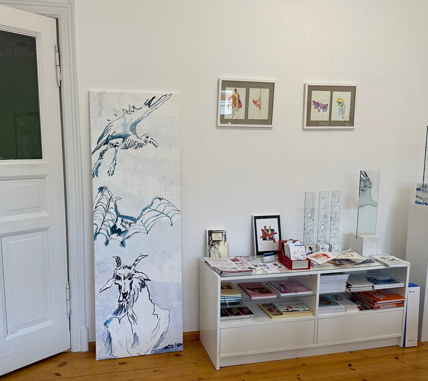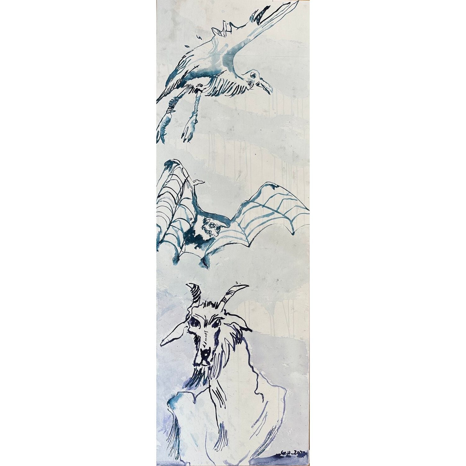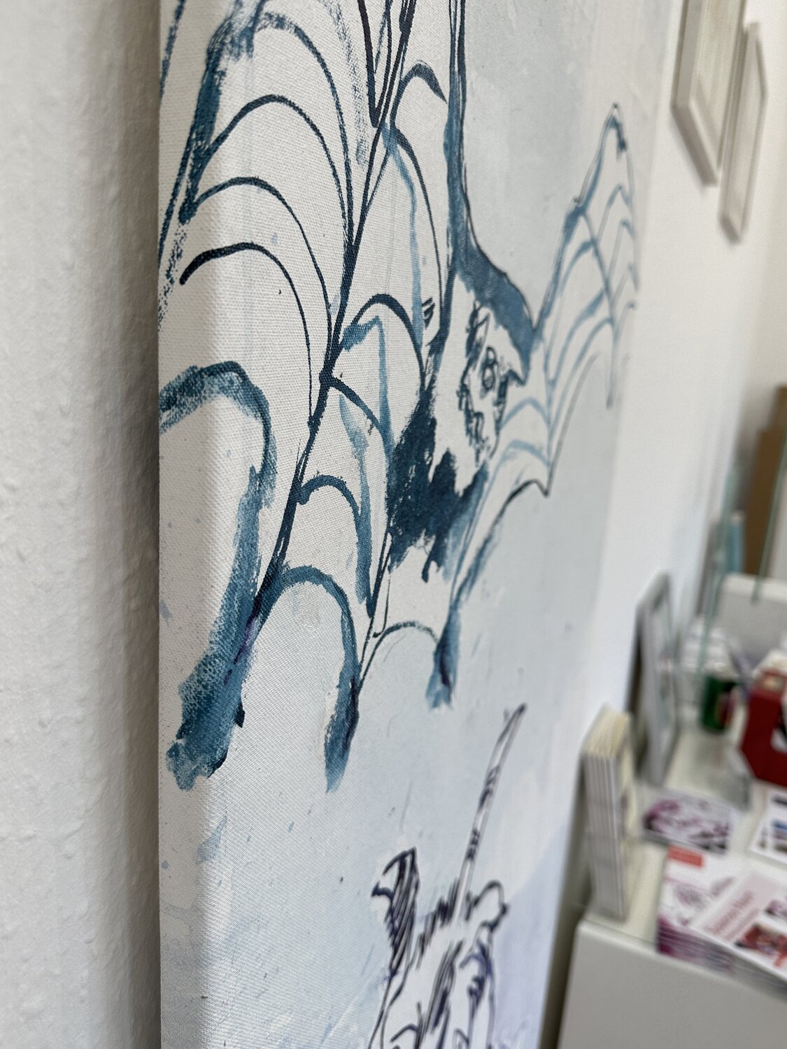 Susanne Haun erzählt bildnerisch die Geschichte der fliegenden Ziege Nanni, der Möwe Kwame und der Fledermaus Julien. Sie verwendet dazu das elegante, hohe Format, und zeichnet auf einer selbst grundierten, derben Leinwand und verwendet wasserfeste Tusche.