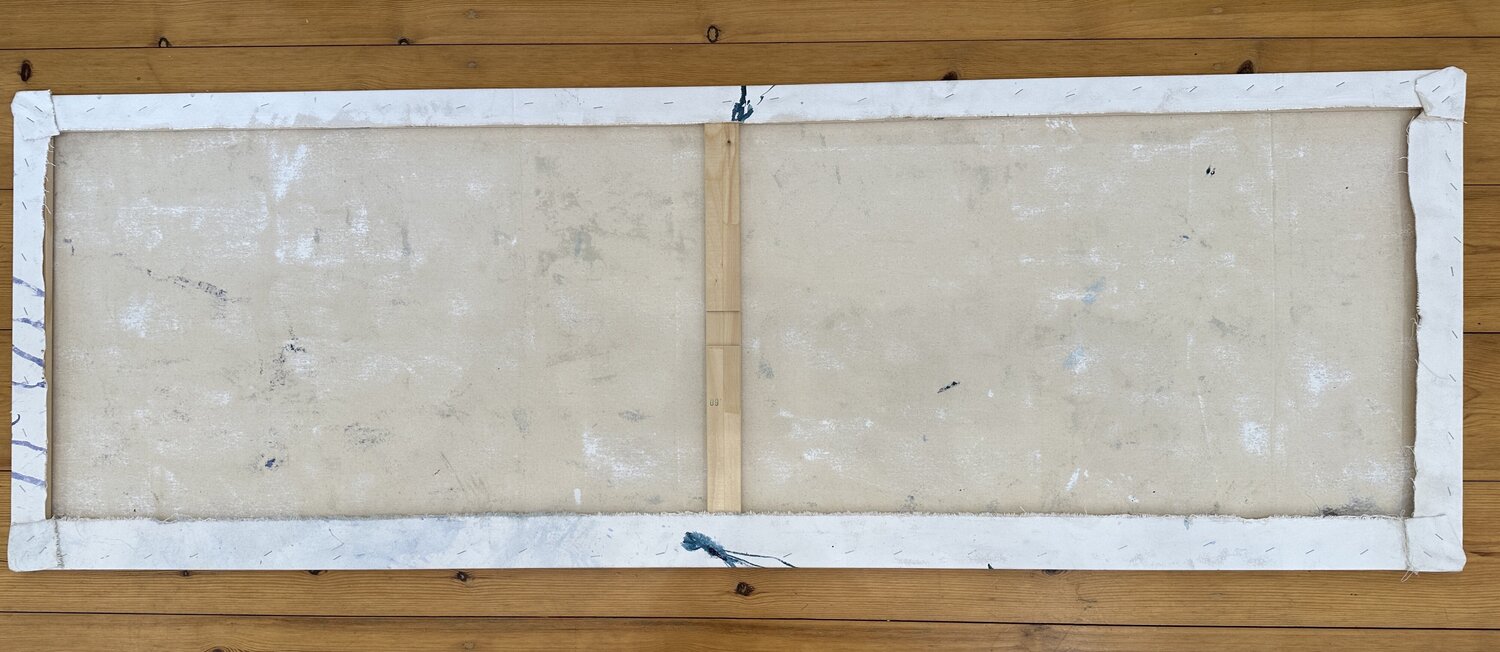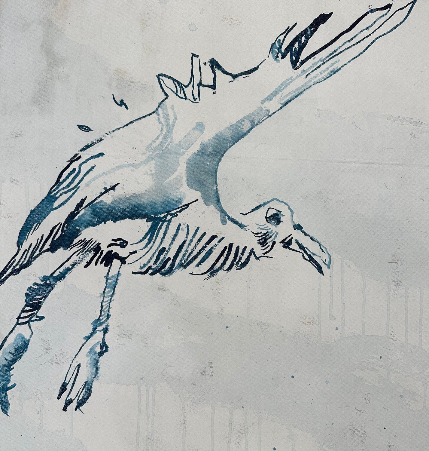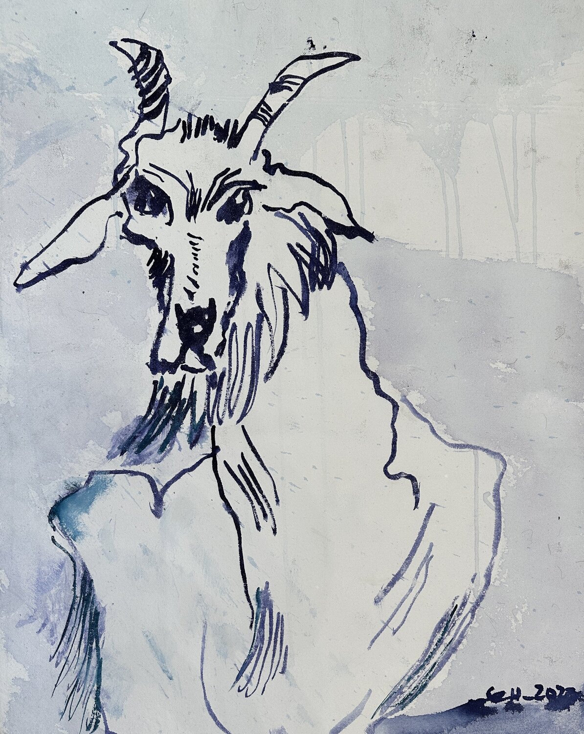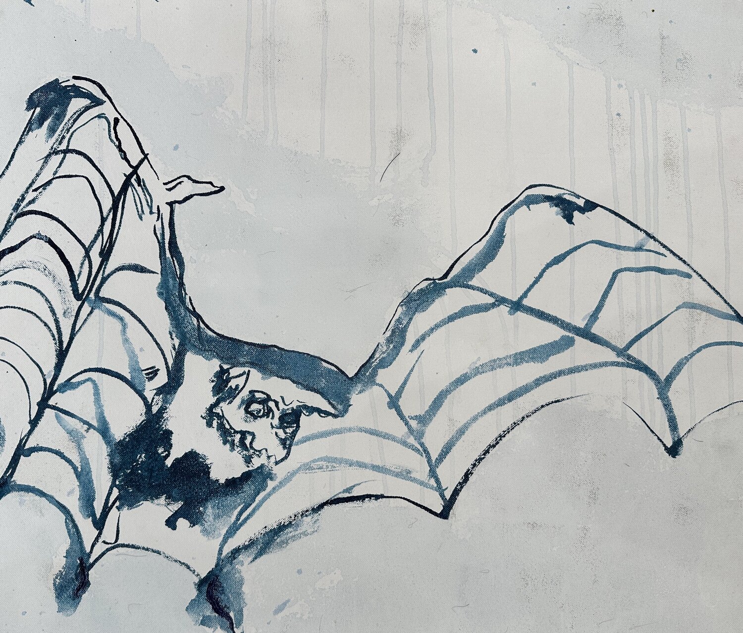 Susanne Haun erzählt bildnerisch die Geschichte der fliegenden Ziege Nanni, der Möwe Kwame und der Fledermaus Julien. Sie verwendet dazu das elegante, hohe Format, und zeichnet auf einer selbst grundierten, derben Leinwand und verwendet wasserfeste Tusche.