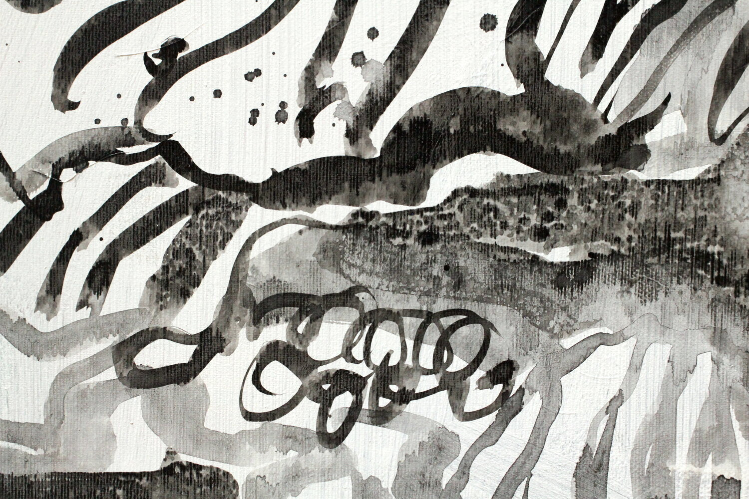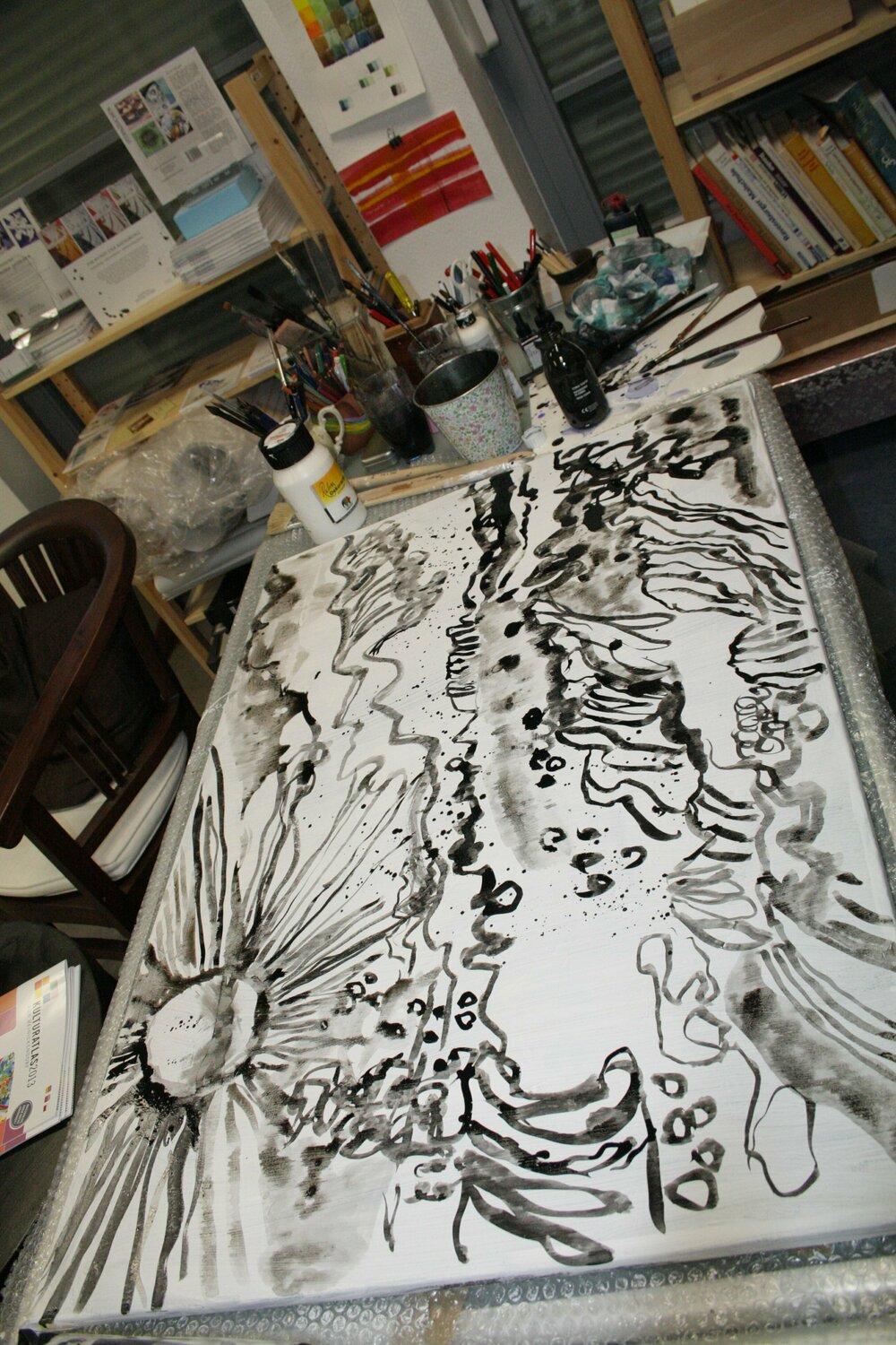 Eine Leinwand braucht Substanz als ein Blatt Papier und trotzdem sollten sie nach Ansicht von Haun eine gewisse Leichtigkeit behalten. Bei der Grösse 70 x 100 cm der hier vorliegenden Leinwand ist das nicht einfach. Nach der ersten Anlage schaut die Künstlerin oft Tage auf das Bild, um zu entscheiden, ob es fertig ist oder nicht. Manchmal grundiert sie entschlossen eine Leinwand neu, manchmal deklariert sie sie als fertig und manchmal bedarf es nur weniger Linien bis sie fertig ist. Gundiert sie die Leinwand neu, achtet sie immer darauf, dass die vorigen Linien durch die neue Grundierung durchscheinen und so als Erinnerungsspuren erhalten bleiben.