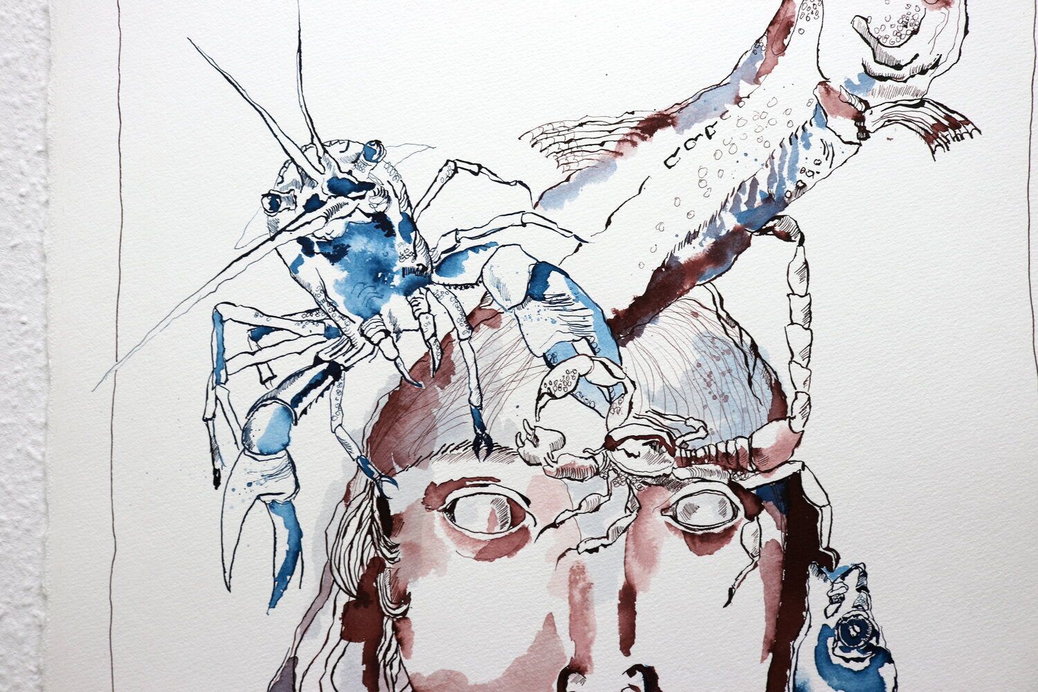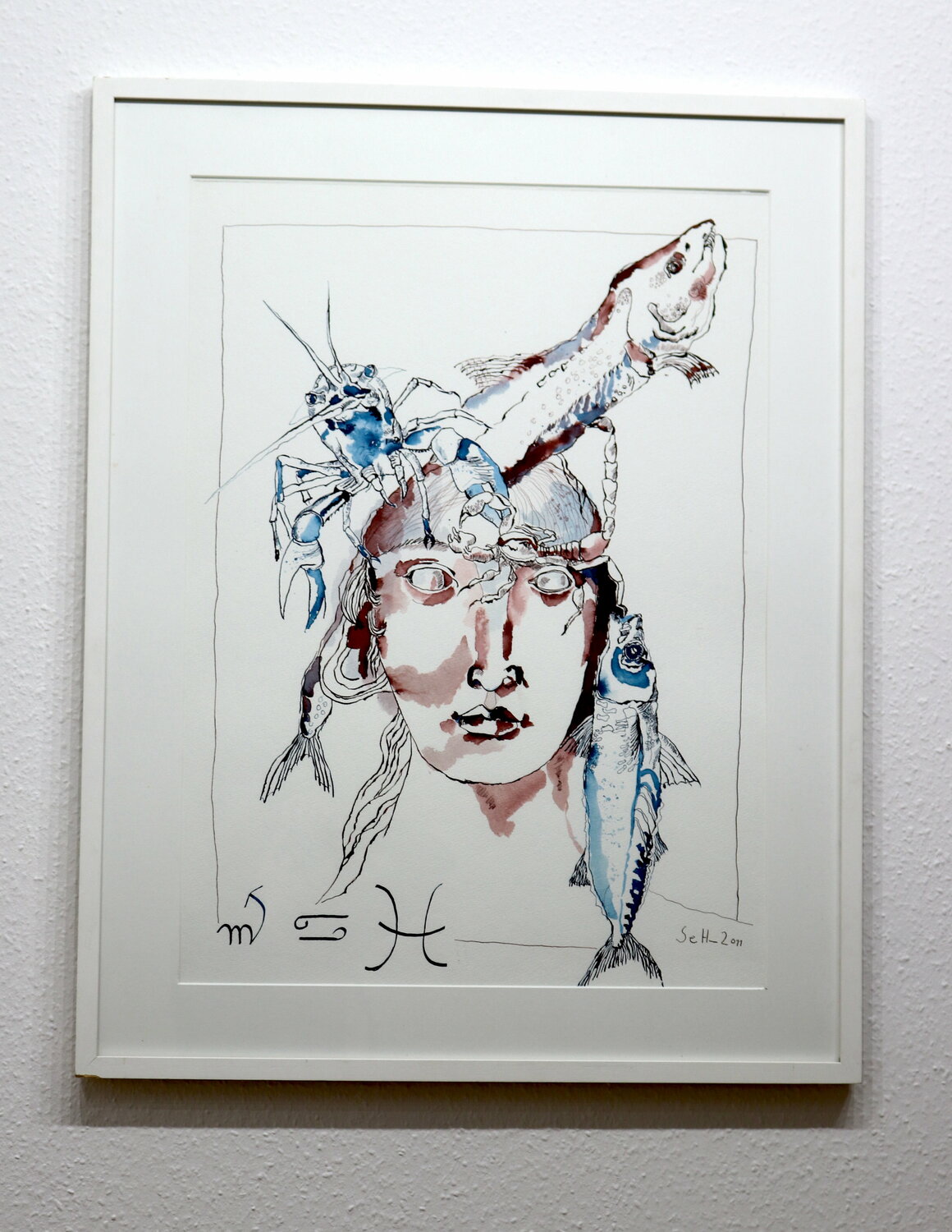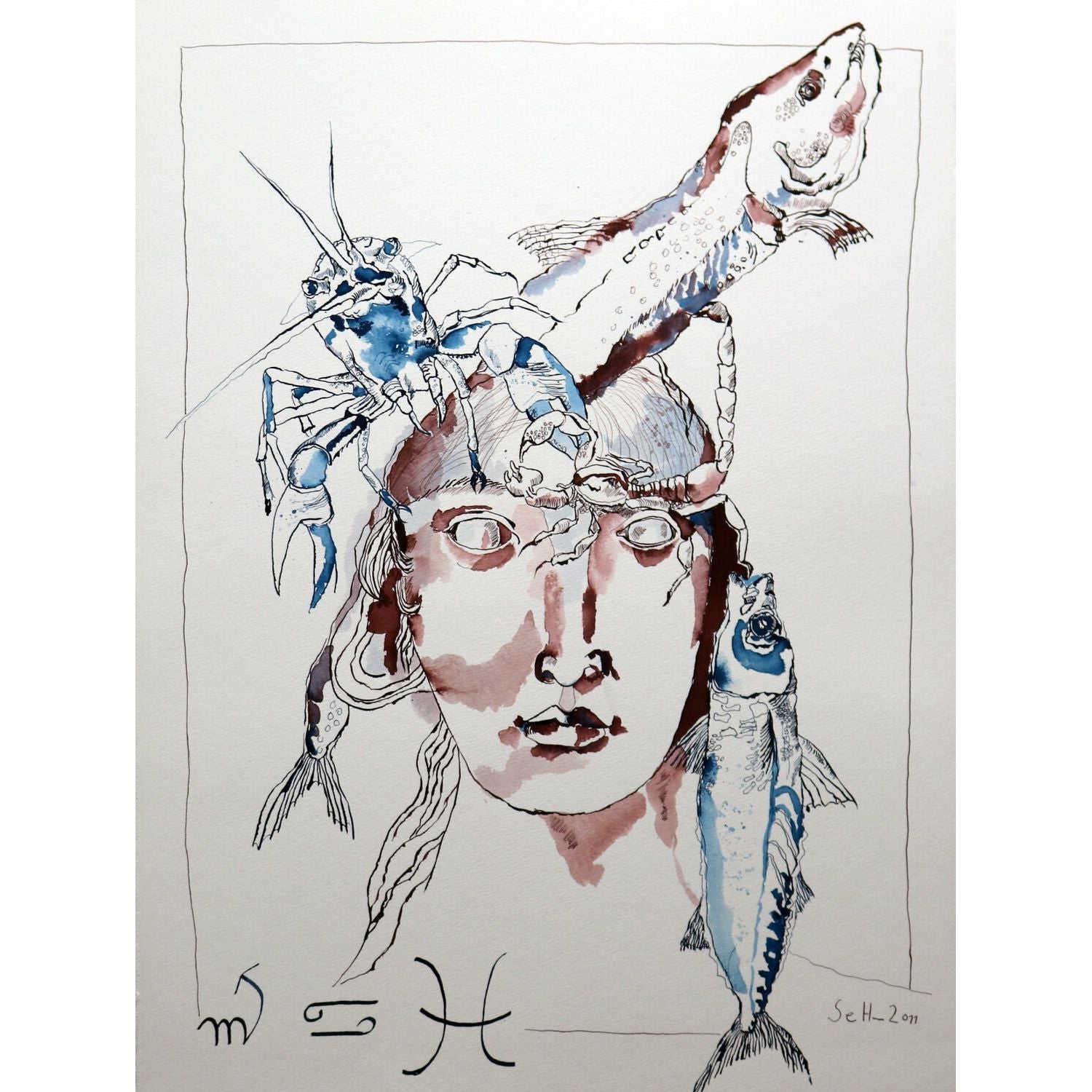 Susanne Haun verwendet als Farbe das Blau des Wassers und den kühlen Blick einer antiken Schönheit um das Nass und die Kühle der im Tierkreiszeichen Krebs, Skorpion und Fisch Geborenen darzustellen. Unten links auf dem Bild sind die Symbole der Tierkreiszeichen kalligraphiert.