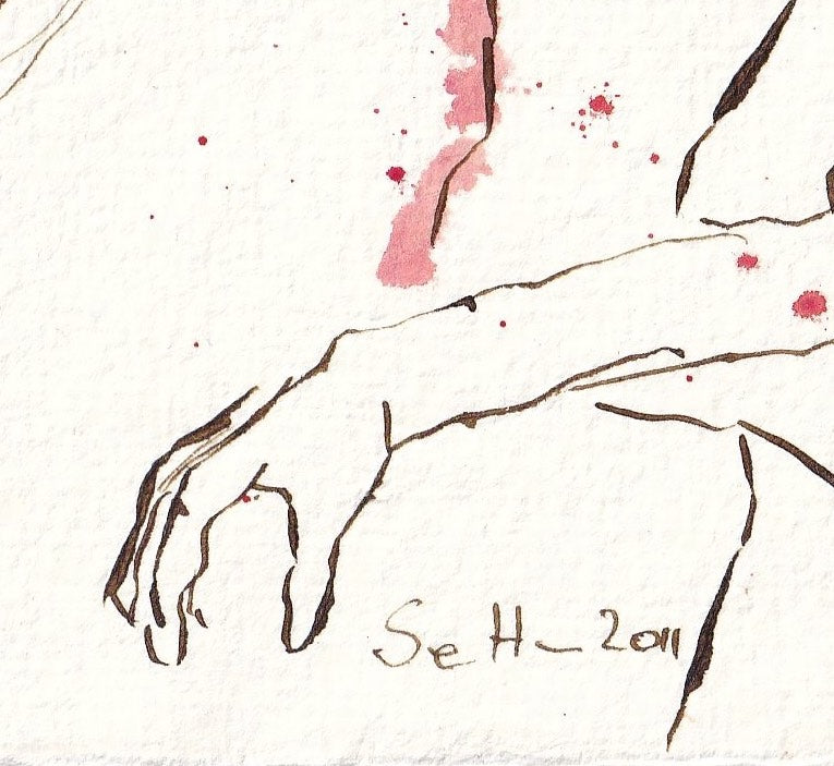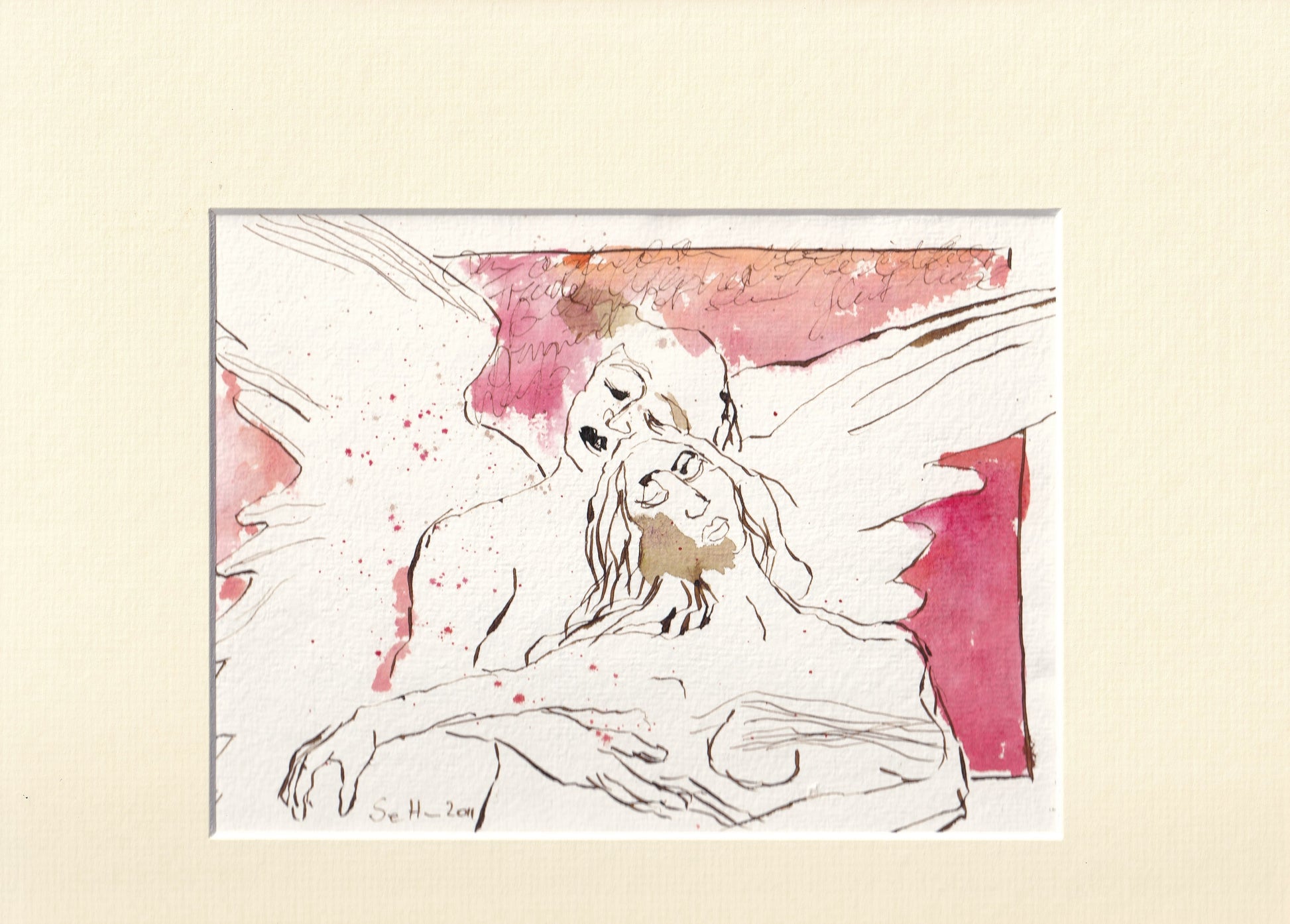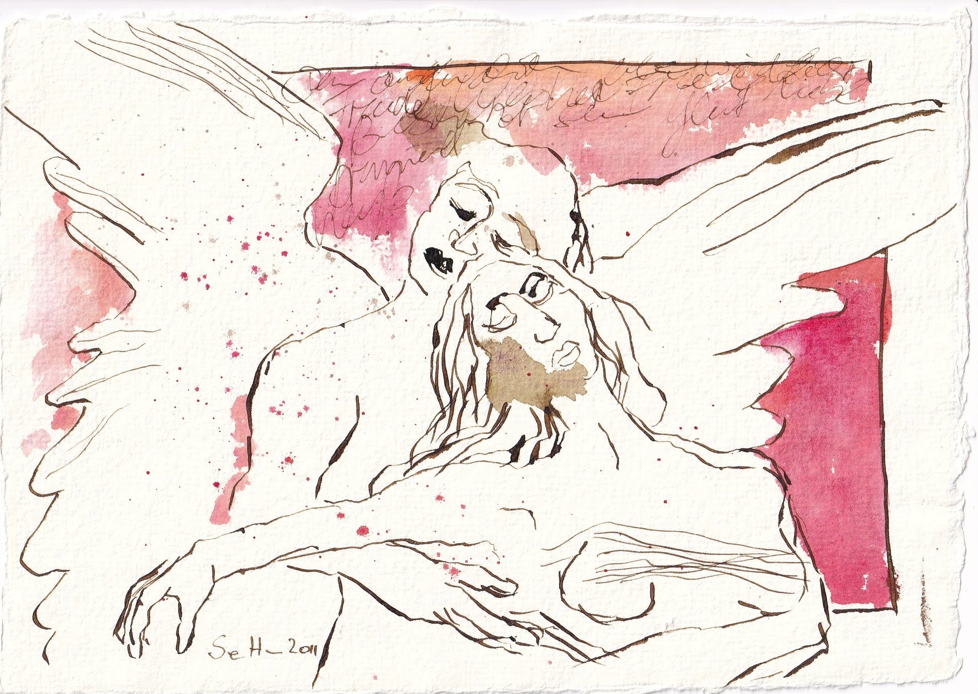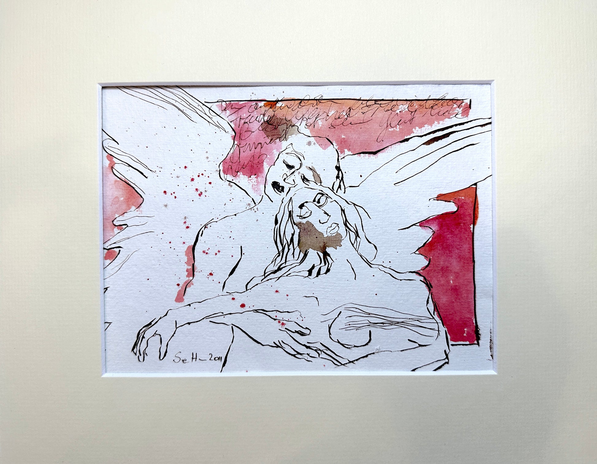 Die Darstellung der Mythologie der Engel ist ein immer wiederkehrendes Thema in den Zeichnungen von Susanne Haun. Eine wichtiges Attribut der Engel sind die Flügel, hier hält der Engel eine Frau in den Armen.