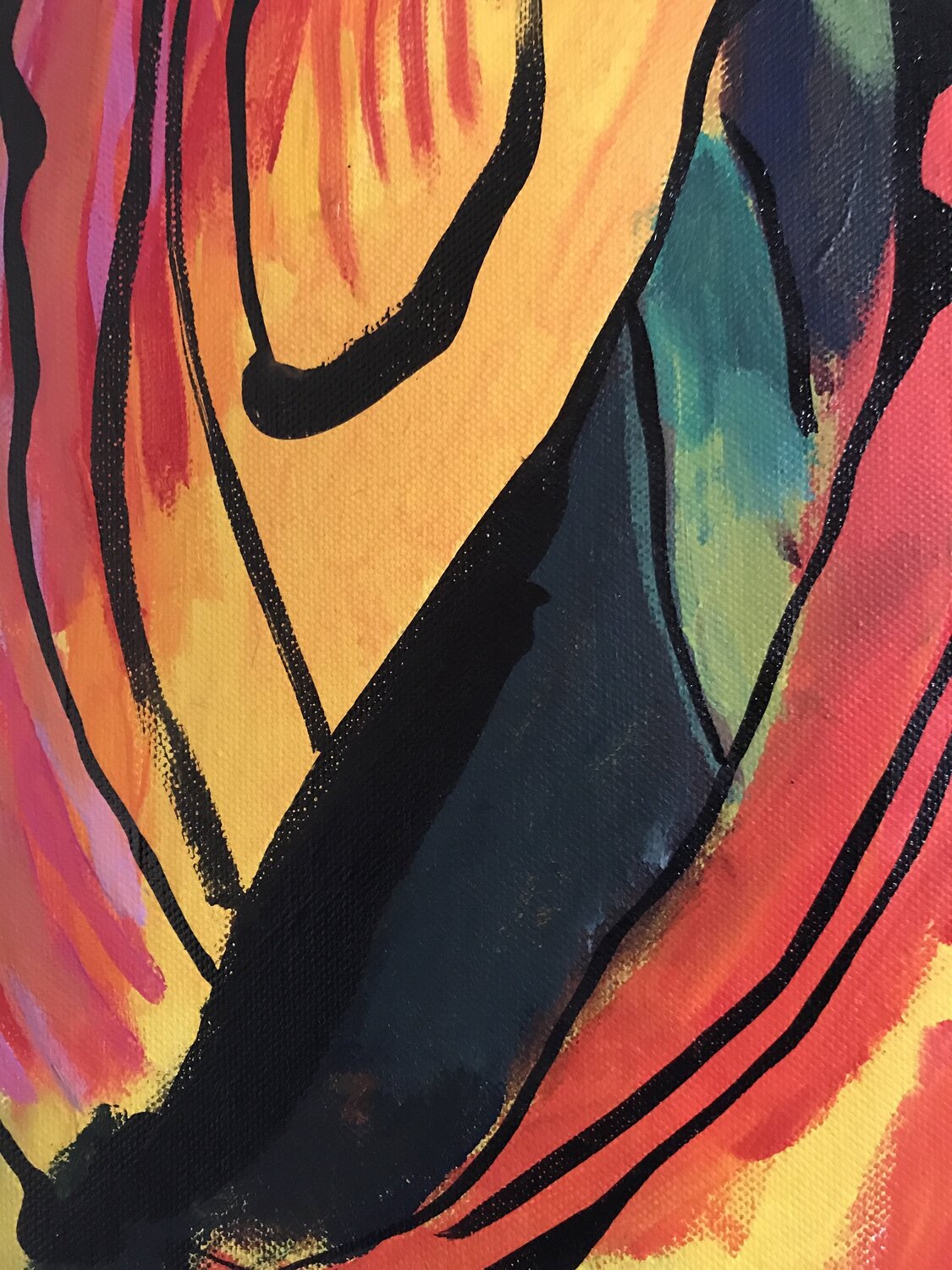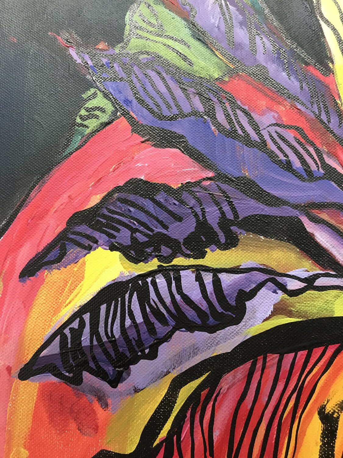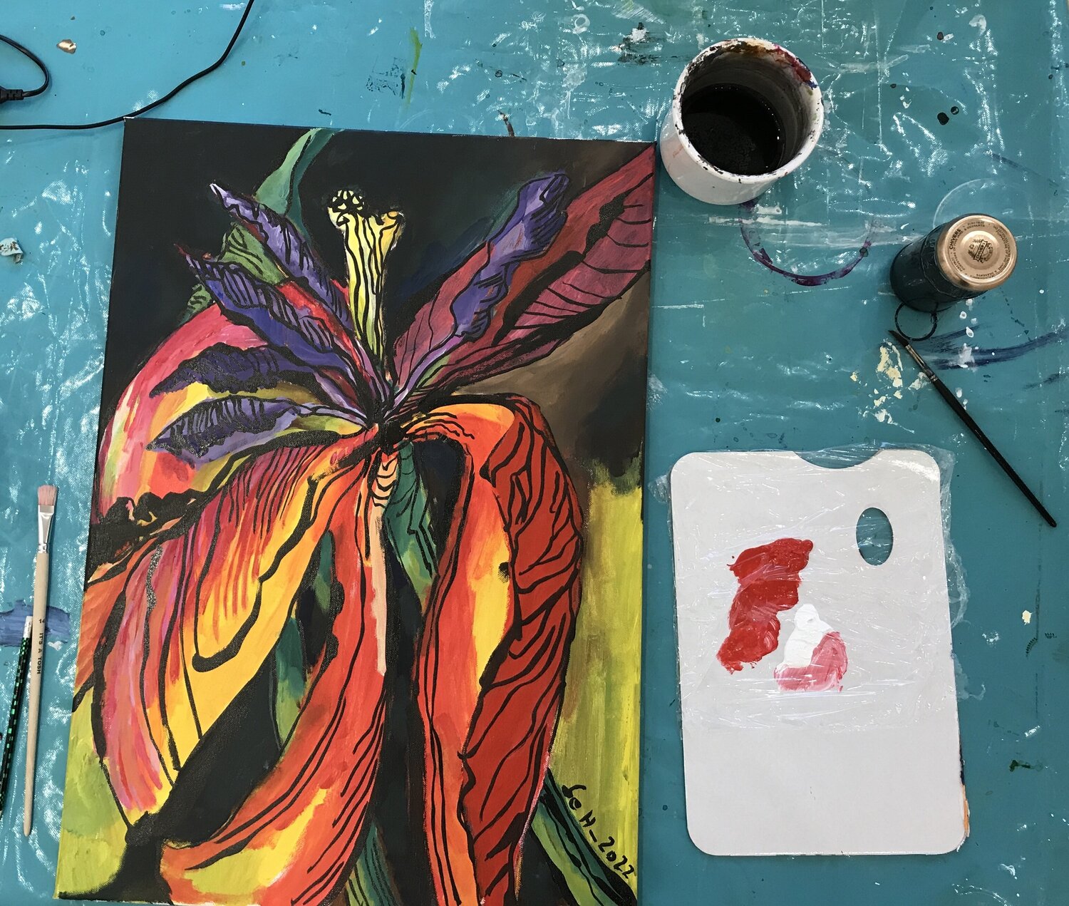 Susanne Hauns ständige Inspiration sind die Pflanzen und Blumen in ihrem Garten. Die auf der Leinwand dargestellte Tulpe ist schon am Verwelken. Einige der Blütenblätter sind vom flammenden Rot ind Bordeaux gewechselt, die herabhängenden Blätter geben das Innere der Pflanze mit den Samenstempeln wieder. Der Hintergrund des Bildes ist in warmen Schwarz dargestellt, so dass die Farben des Gemäldes dem Betrachter entgegen leuchten. Die Künstlerin ist eine große Bewunderin von Maria Sibylla Merian und das berühmte Tulpen-Sujet findet sich oft in ihren Bildern wieder.