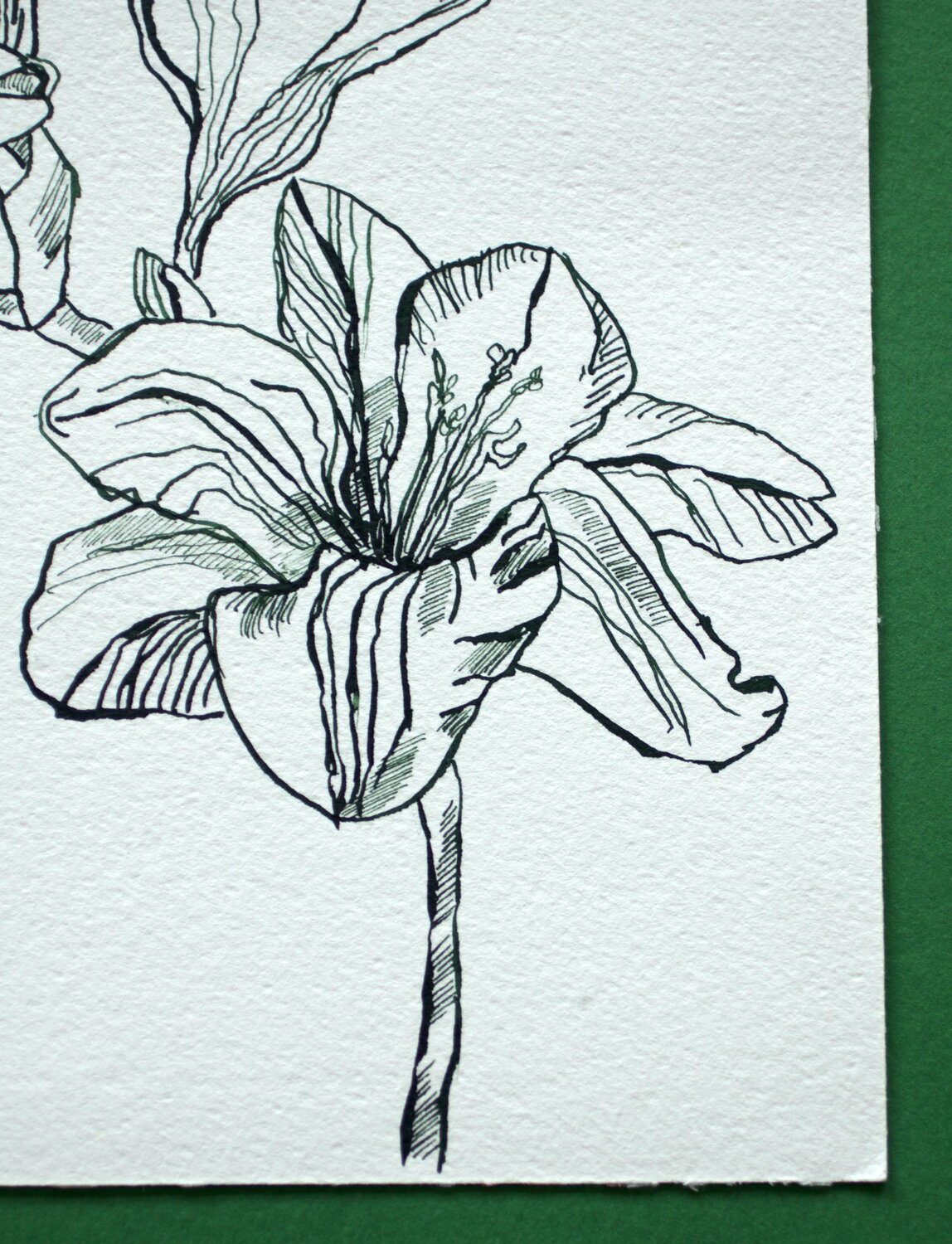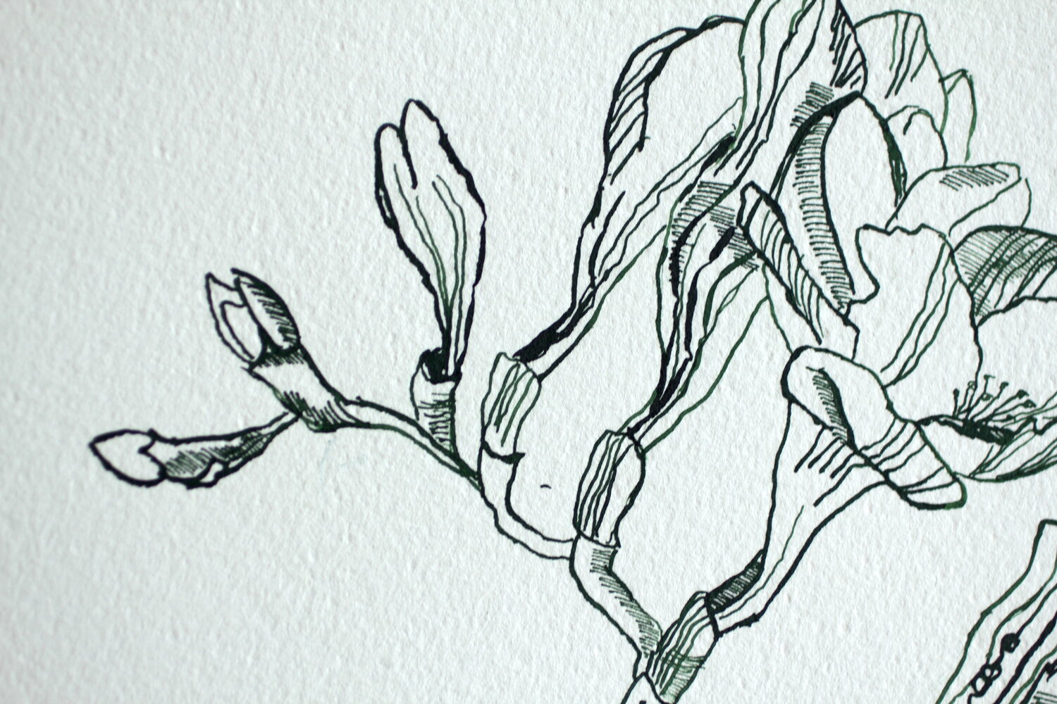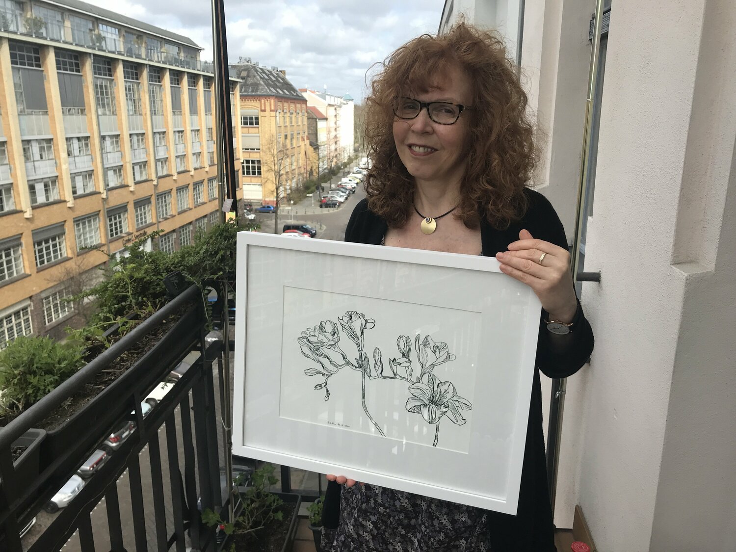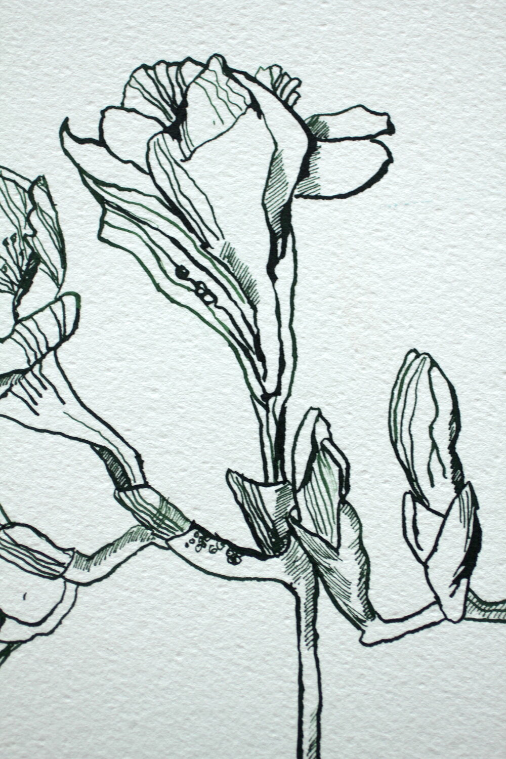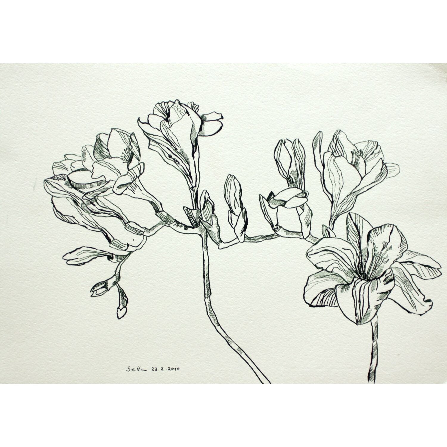 Susanne Haun, zeichnet, was sie sieht und doch ist es wie im Fall der Fresien auch ein Blick nach Innen, die die Linie so bewegt erscheinen lässt. Die hier abgebildeten Fresien waren als Modell ein Fund des Tages. In den meisten Lebensmittelläden stehen vorne im Zug die traurig abgepackten Blumen in häßlicher Plastikfolie. Haun rettete die Fresien vor dem Verwelken, in dem sie sie kaufte und zum Model erhob.
