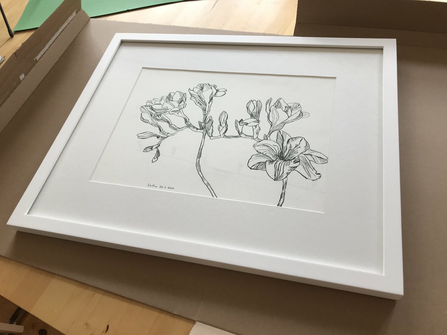 Die Arbeit ist unter Glas mit weißer Holzleiste und Passpartout in der Größe 40 x 50 cm gerahmt. Der Rahmen hat eine Tiefe von 2,5 cm.