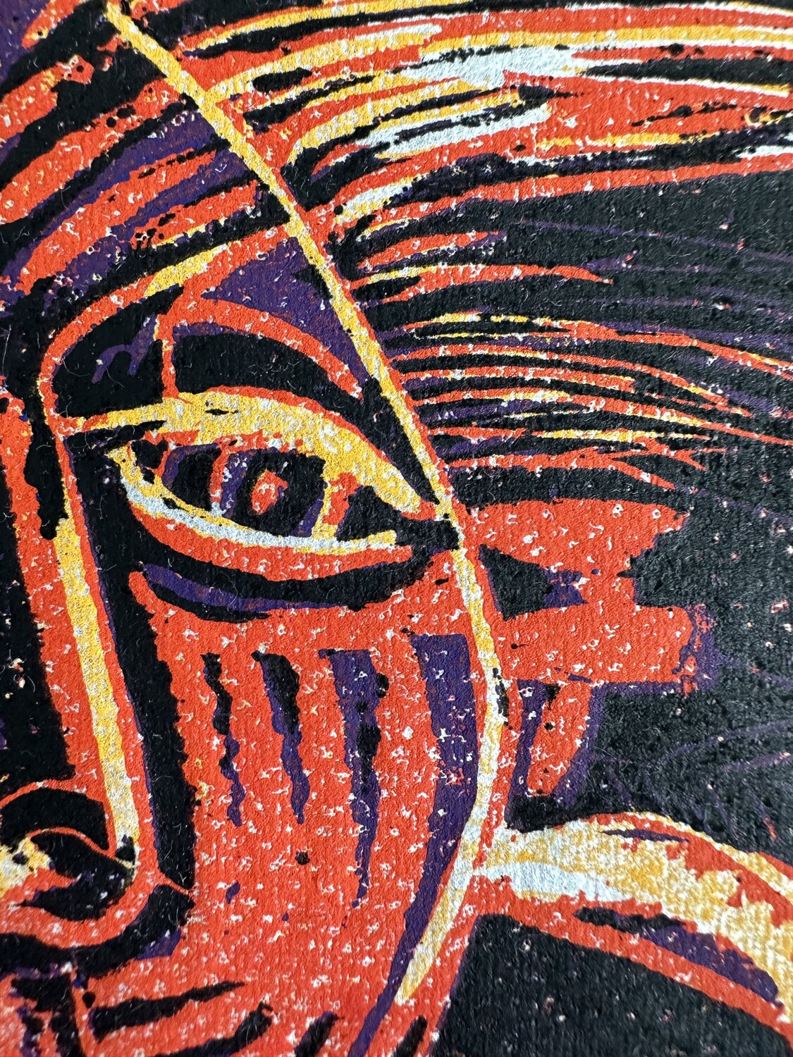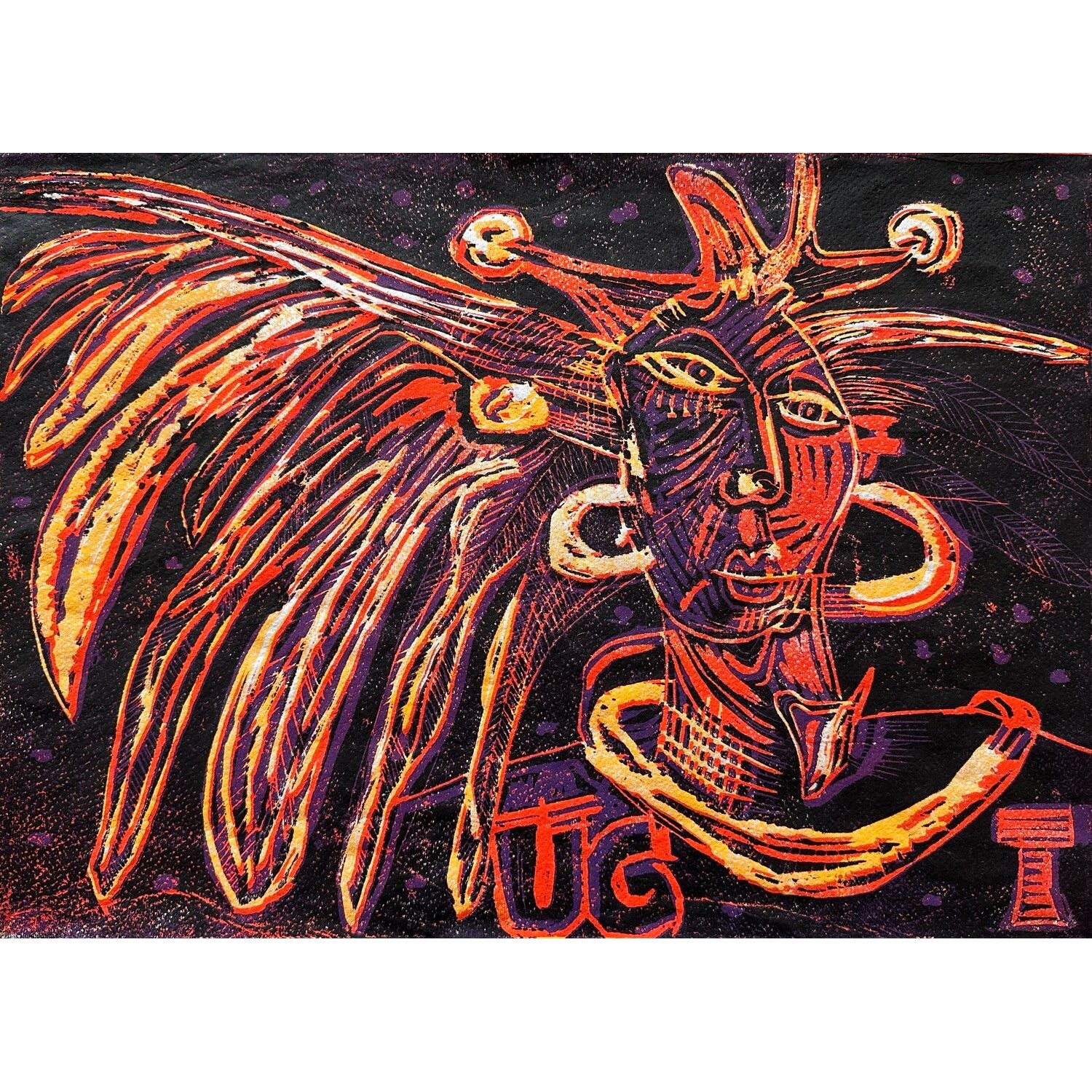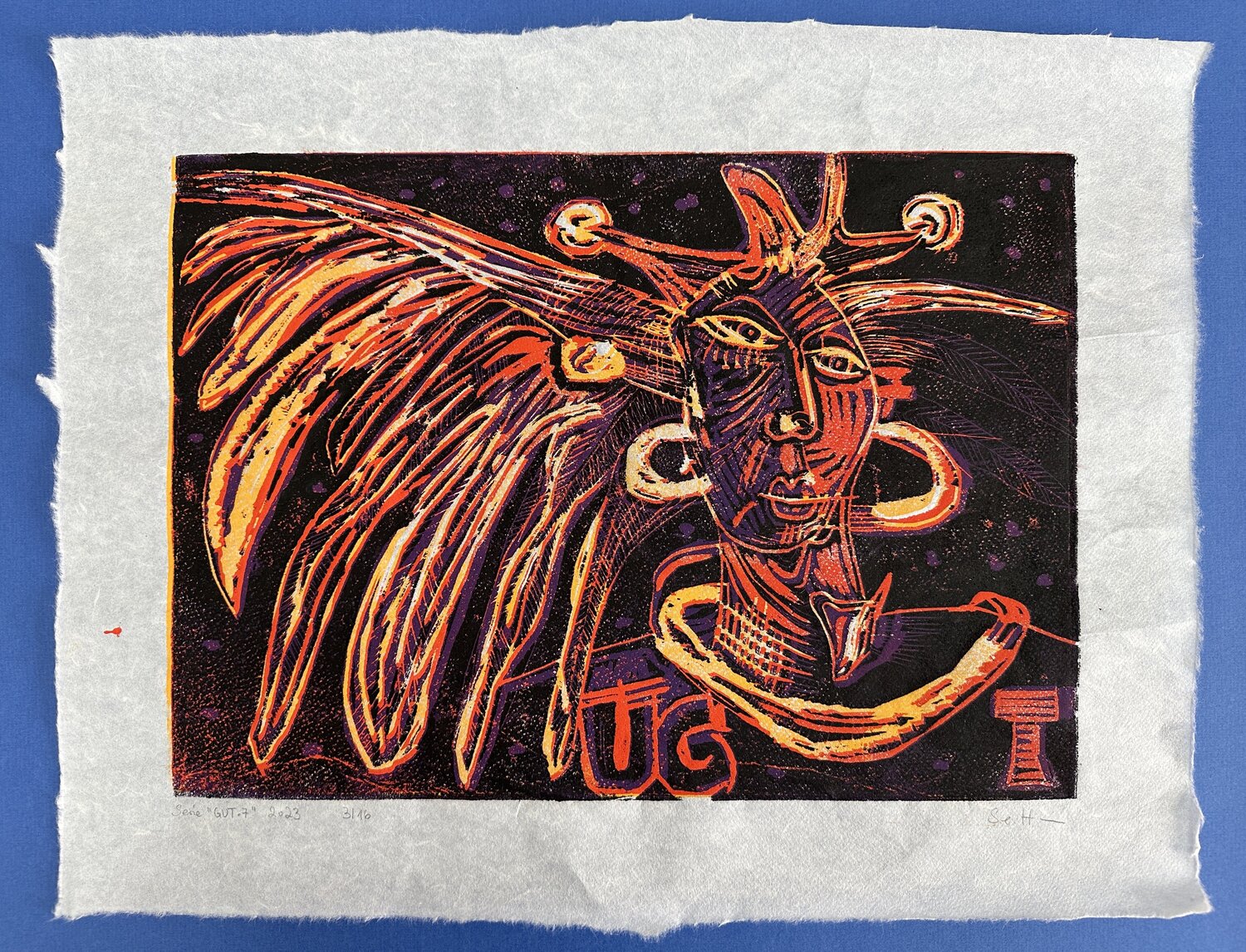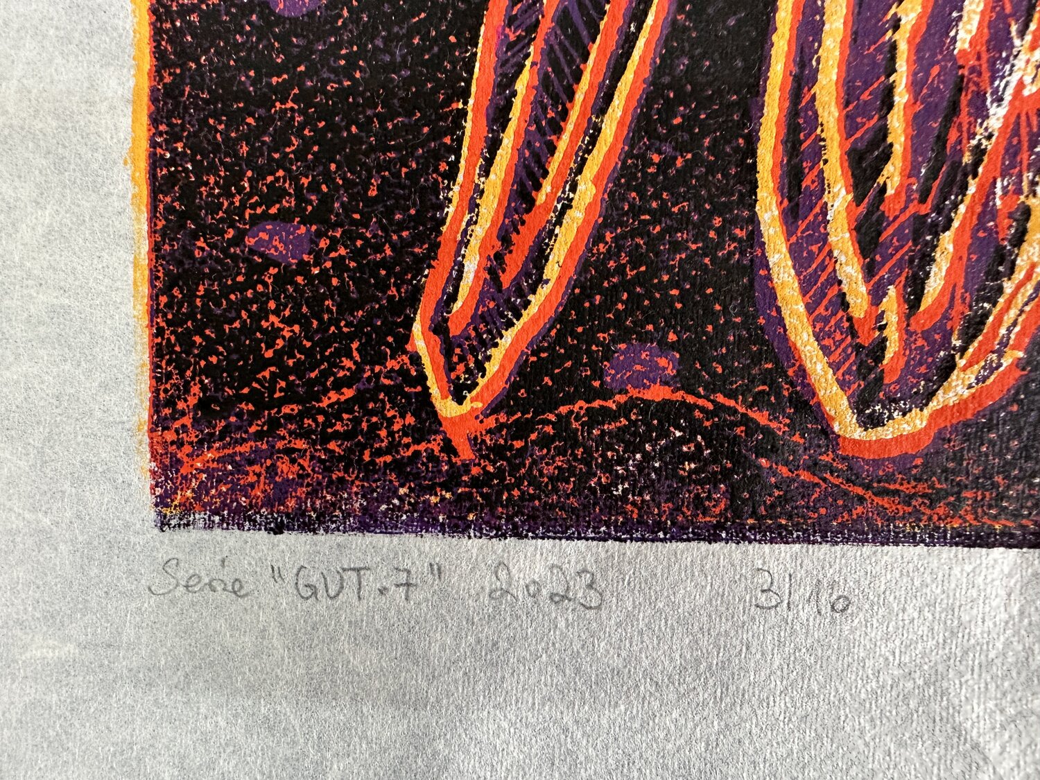 Susanne Haun arbeitet seit 1999 Holzschnitte nach dem Prinzip der verlorenen Form, das schon Picasso anwandte. Sie verwandte die Holzplatte in immer wieder neuen Farben und nach (fast) jedem Druck schnitt sie an der Platte. Dieser Druck wurde in Gelb (1), rot (2), Lila (3) und Schwarz in vier Schritten gedruckt. Das Blattmaß ist 41 x 52,5 cm. Von der Platte gibt es 16 Unikatdrucke und 1 e.a. Das Gesicht lächelt die Betrachterin / den Betrachter an, die Augen stehen leicht schräg und statt Haar wachsen Federn und eine Narrenkappe aus dem Kopf. Zwei große Ohrringe halten das Gleichgewicht zu dem schweren Kopfschmuck. Es wird alles gut werden. Das bezeugen die Buchstaben UGT und die Ziffer 7.