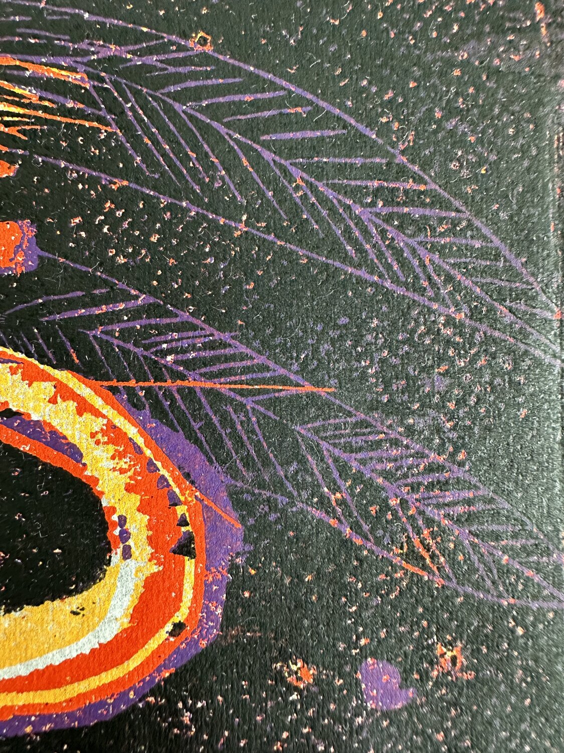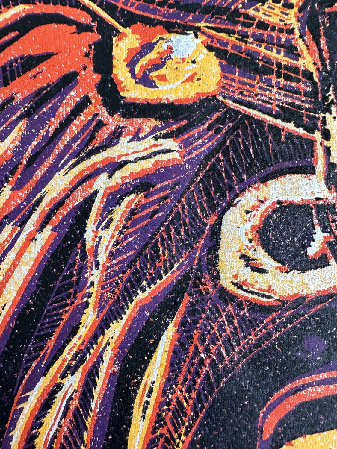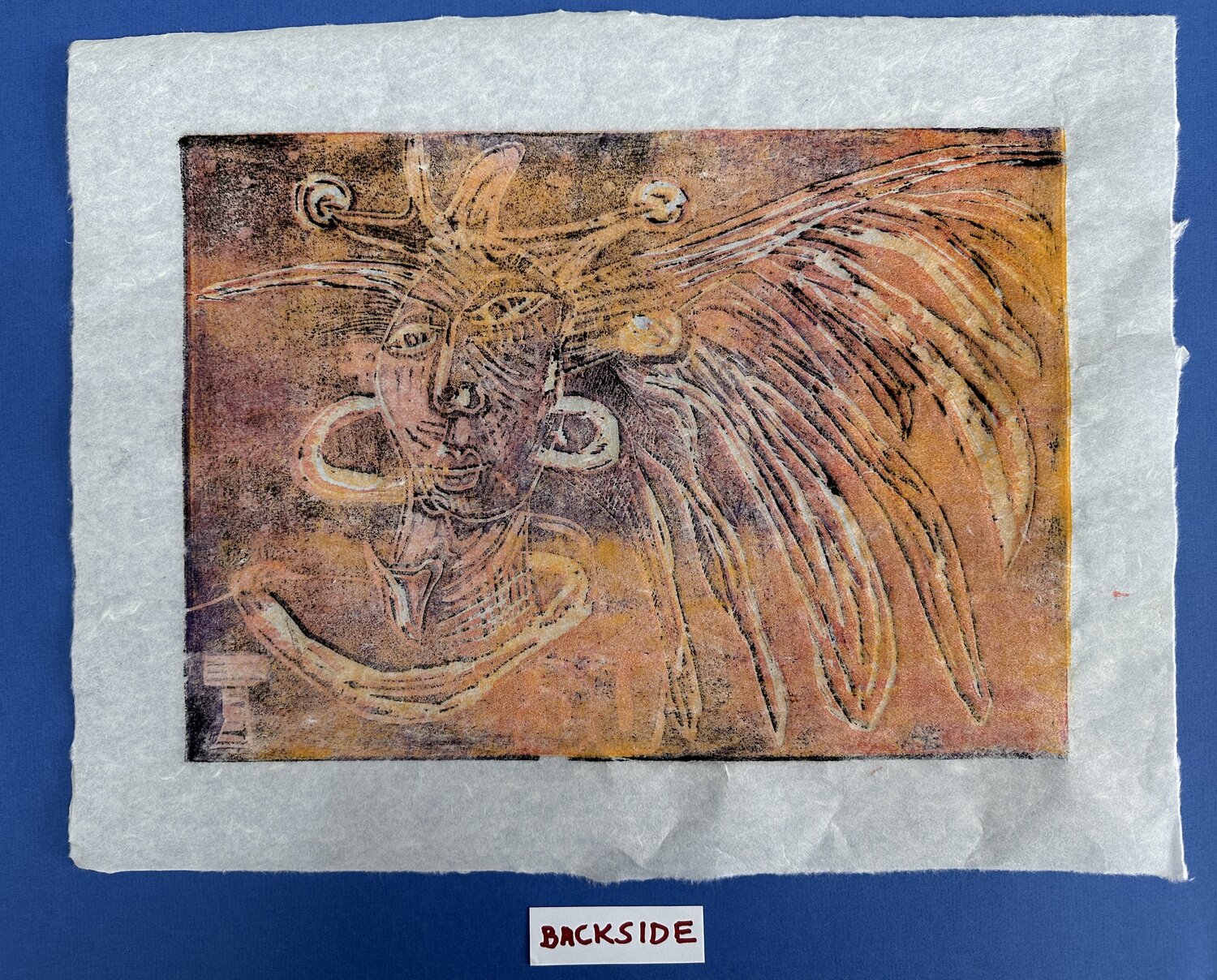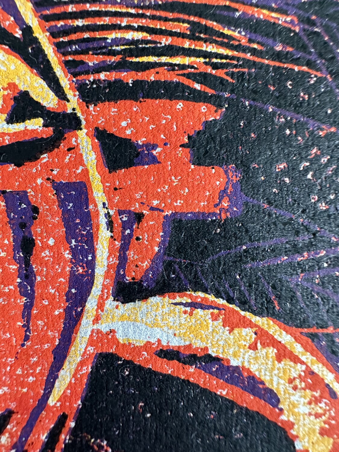 Susanne Haun arbeitet seit 1999 Holzschnitte nach dem Prinzip der verlorenen Form, das schon Picasso anwandte. Sie verwandte die Holzplatte in immer wieder neuen Farben und nach (fast) jedem Druck schnitt sie an der Platte. Dieser Druck wurde in Gelb (1), rot (2), Lila (3) und Schwarz in vier Schritten gedruckt. Das Blattmaß ist 41 x 52,5 cm. Von der Platte gibt es 16 Unikatdrucke und 1 e.a. Das Gesicht lächelt die Betrachterin / den Betrachter an, die Augen stehen leicht schräg und statt Haar wachsen Federn und eine Narrenkappe aus dem Kopf. Zwei große Ohrringe halten das Gleichgewicht zu dem schweren Kopfschmuck. Es wird alles gut werden. Das bezeugen die Buchstaben UGT und die Ziffer 7.
