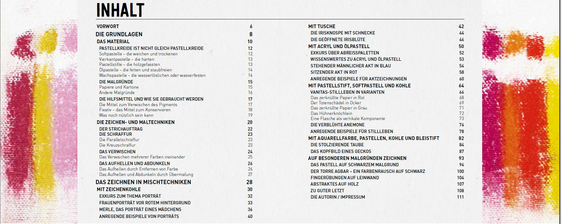 Das Besondere an Pastellfarben ist die Reinheit des Farbpigments. Ein Minimum an Bindemitteln hält die Pigmente zusammen, deren Farben beim Auftragen intensiv leuchten. Diese Eigenschaft ermöglicht sowohl das strichartige Arbeiten beim Skizzieren und Zeichnen als auch das flächige in der Maltechnik. Die Berliner Künstlerin Susanne Haun verwendet in ihren Bildern Pastelle experimentierfreudig, häufig in Verbindung mit anderen Materialien wie Tusche, Acryl, Aquarell und Kohle. Anhand ausgewählter Motive von Pflanzen über Tiere, Menschen und Stillleben erklärt sie die Grundlagen des Materials und der vielseitigen Techniken und regt zu eigenen Motiven und Mischungen an. Schritt für Schritt können Sie so Ihre eigene Bildsprache finden.