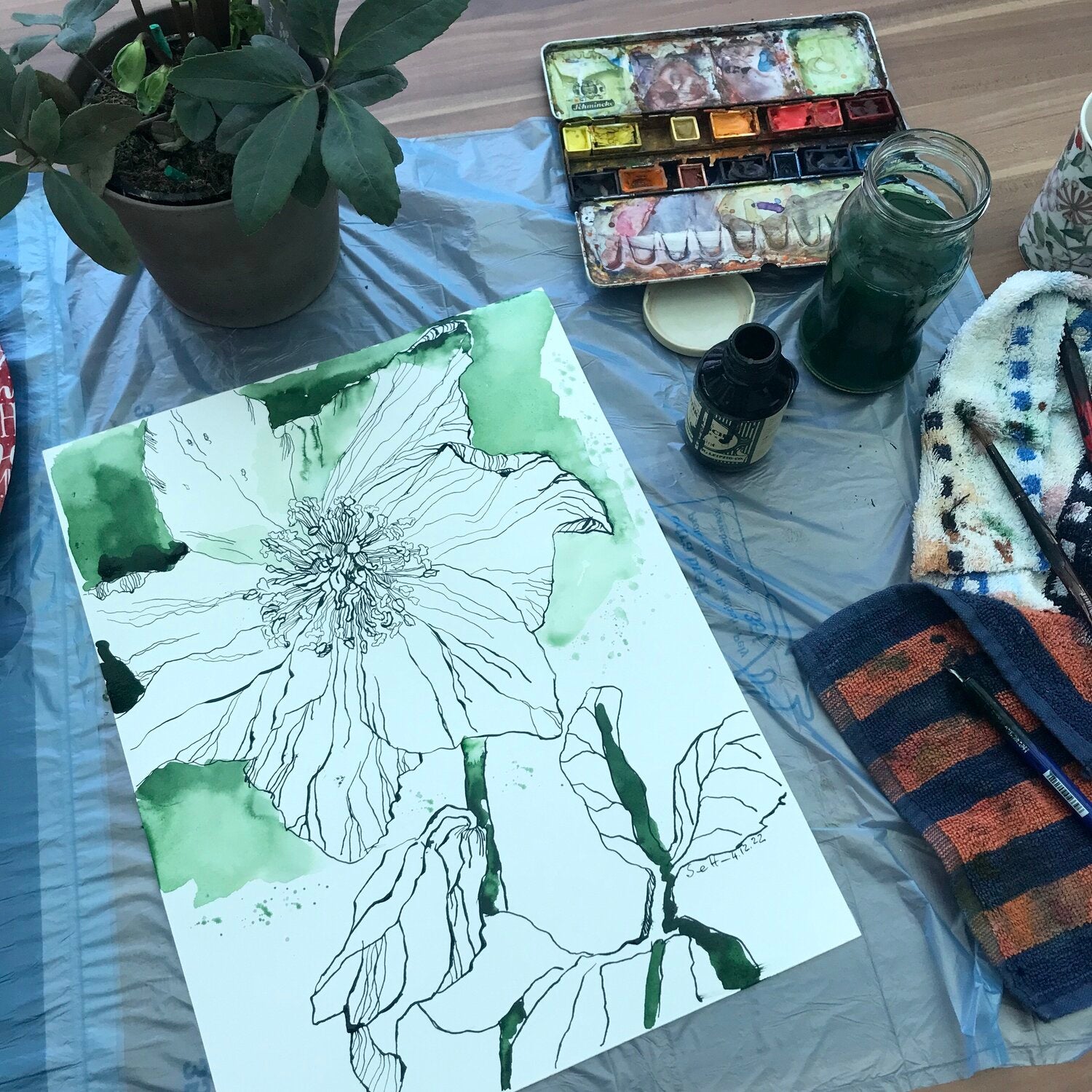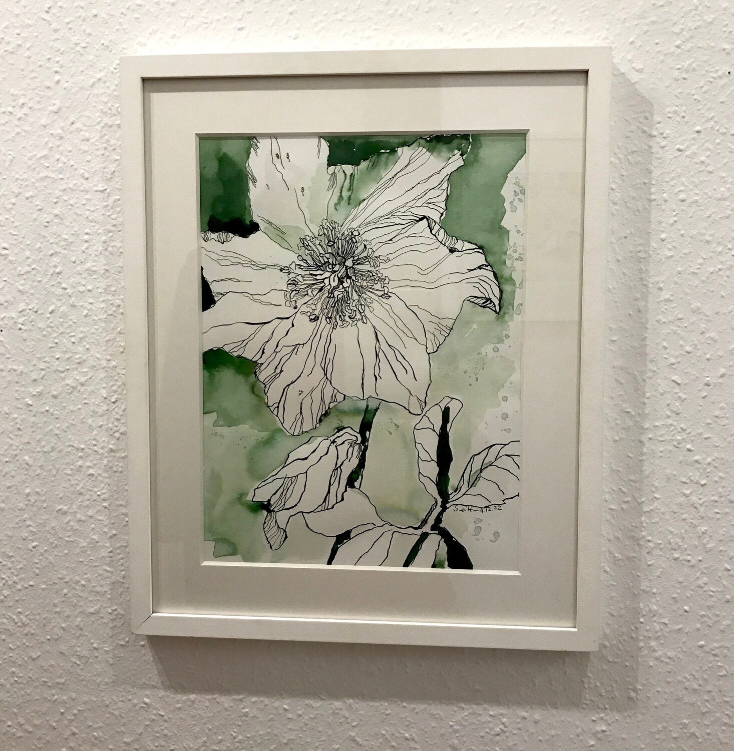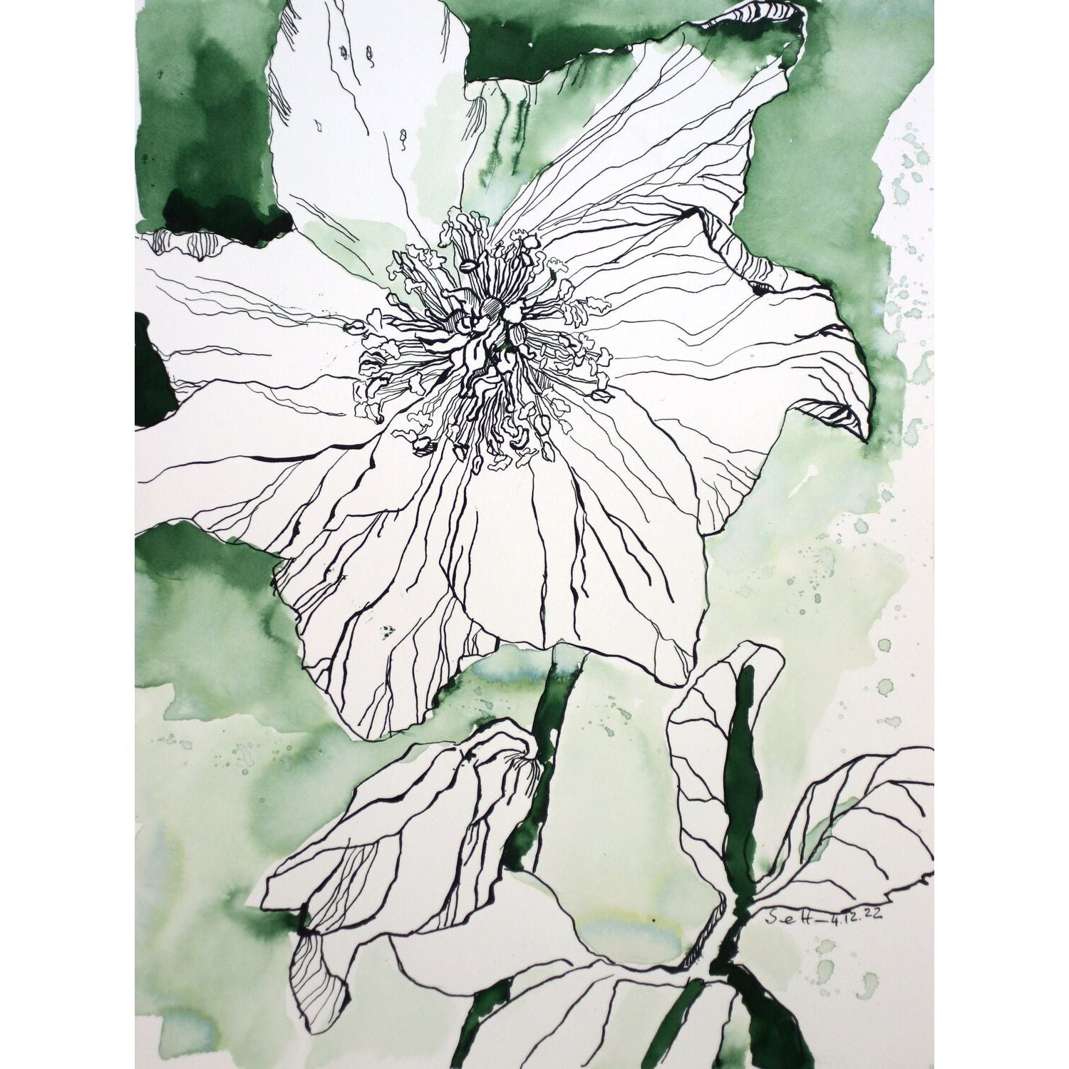 Christrosen blühen im Winter und erfreuen zur Weihnachtszeit die Herzen, wenn der Garten sonst im grauen, nebeligen Dunst liegt. Susanne Haun interpretiert die weißen Blüten, die wie Schnee anmuten, jedes Jahr aufs Neue. Dabei ist es ihr wichtig, mit dem Papierweiß zu arbeiten. Die Blüten erhalten ihre Lebendigkeit aufgrund der Linien, die Haun mit der Feder und dem Tusche Fass zieht. Der dunkle, lotusgrüne Hintergrund verstärkt das weiß der einzelnen Blüten. Auch, wenn die Weihnachtszeit vorbei ist, leuchtet die weiße Blume von der Wand.
