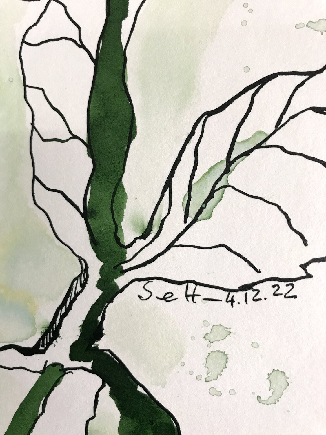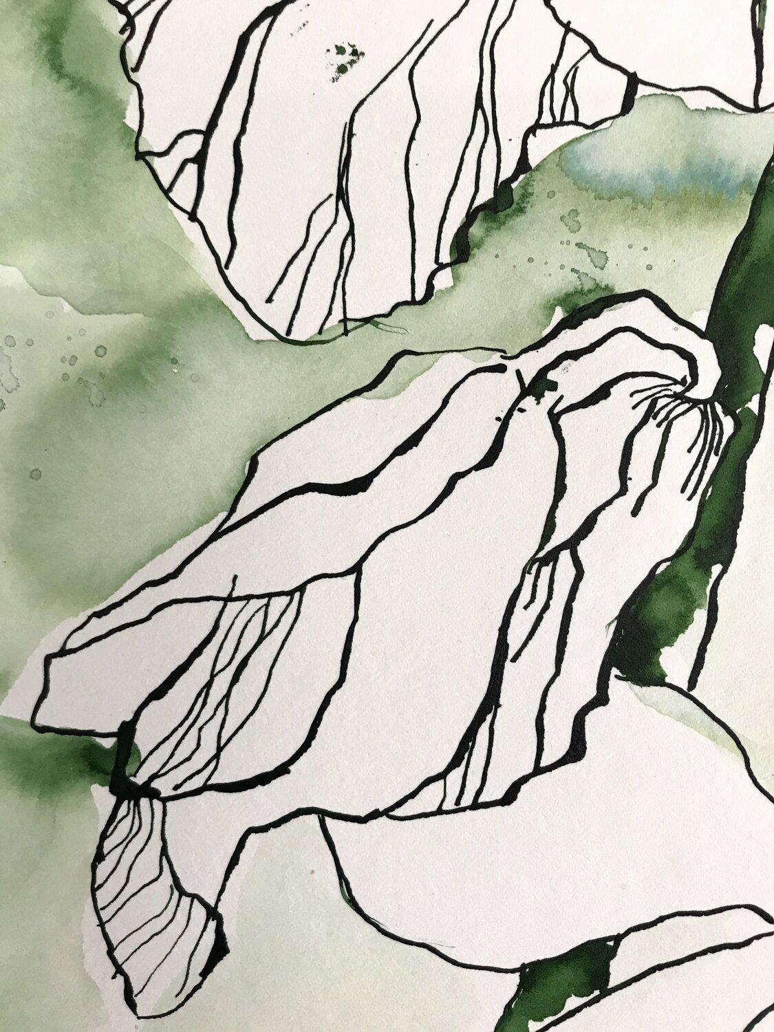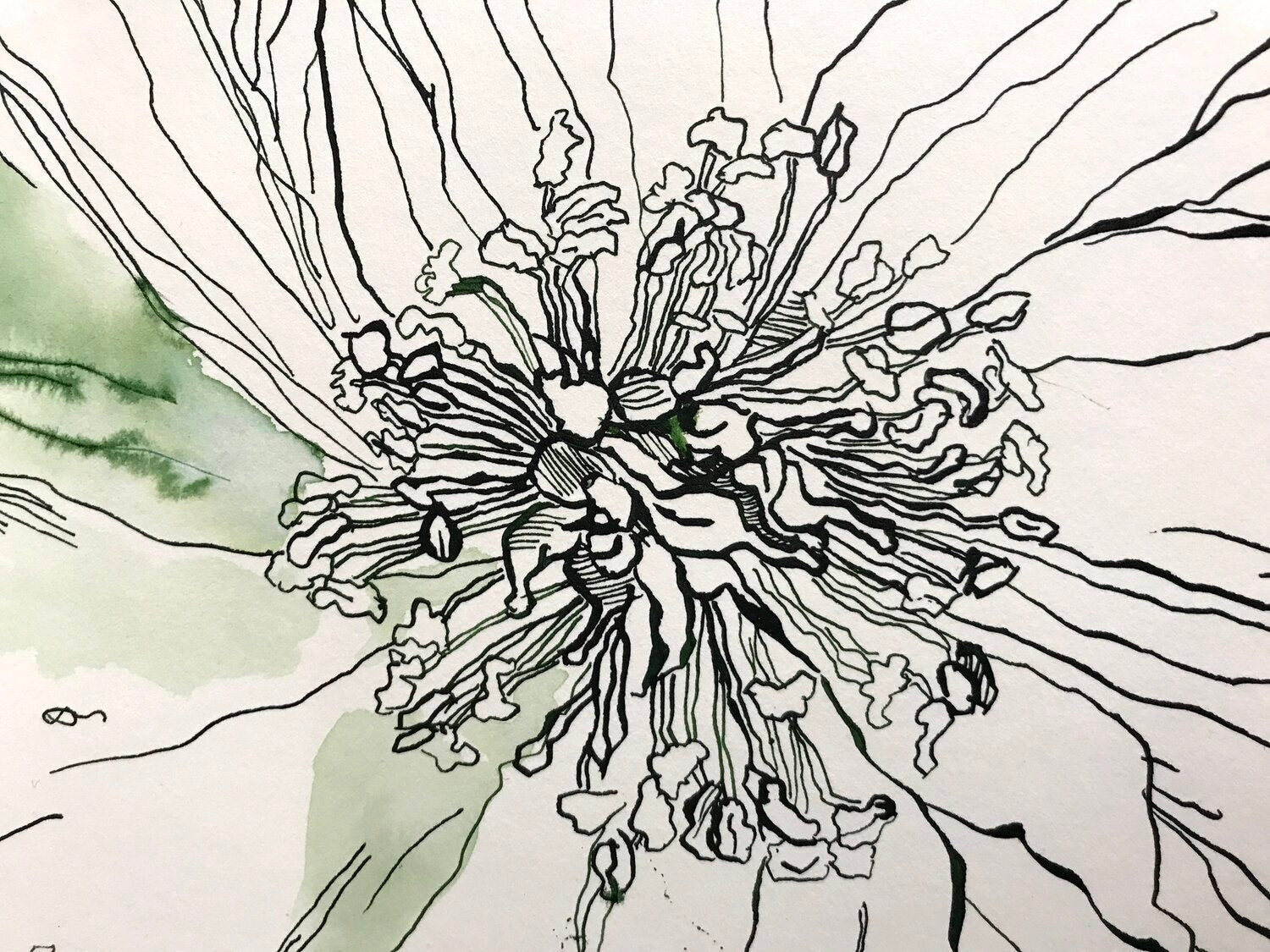 Christrosen blühen im Winter und erfreuen zur Weihnachtszeit die Herzen, wenn der Garten sonst im grauen, nebeligen Dunst liegt. Susanne Haun interpretiert die weißen Blüten, die wie Schnee anmuten, jedes Jahr aufs Neue. Dabei ist es ihr wichtig, mit dem Papierweiß zu arbeiten. Die Blüten erhalten ihre Lebendigkeit aufgrund der Linien, die Haun mit der Feder und dem Tusche Fass zieht. Der dunkle, lotusgrüne Hintergrund verstärkt das weiß der einzelnen Blüten. Auch, wenn die Weihnachtszeit vorbei ist, leuchtet die weiße Blume von der Wand.
