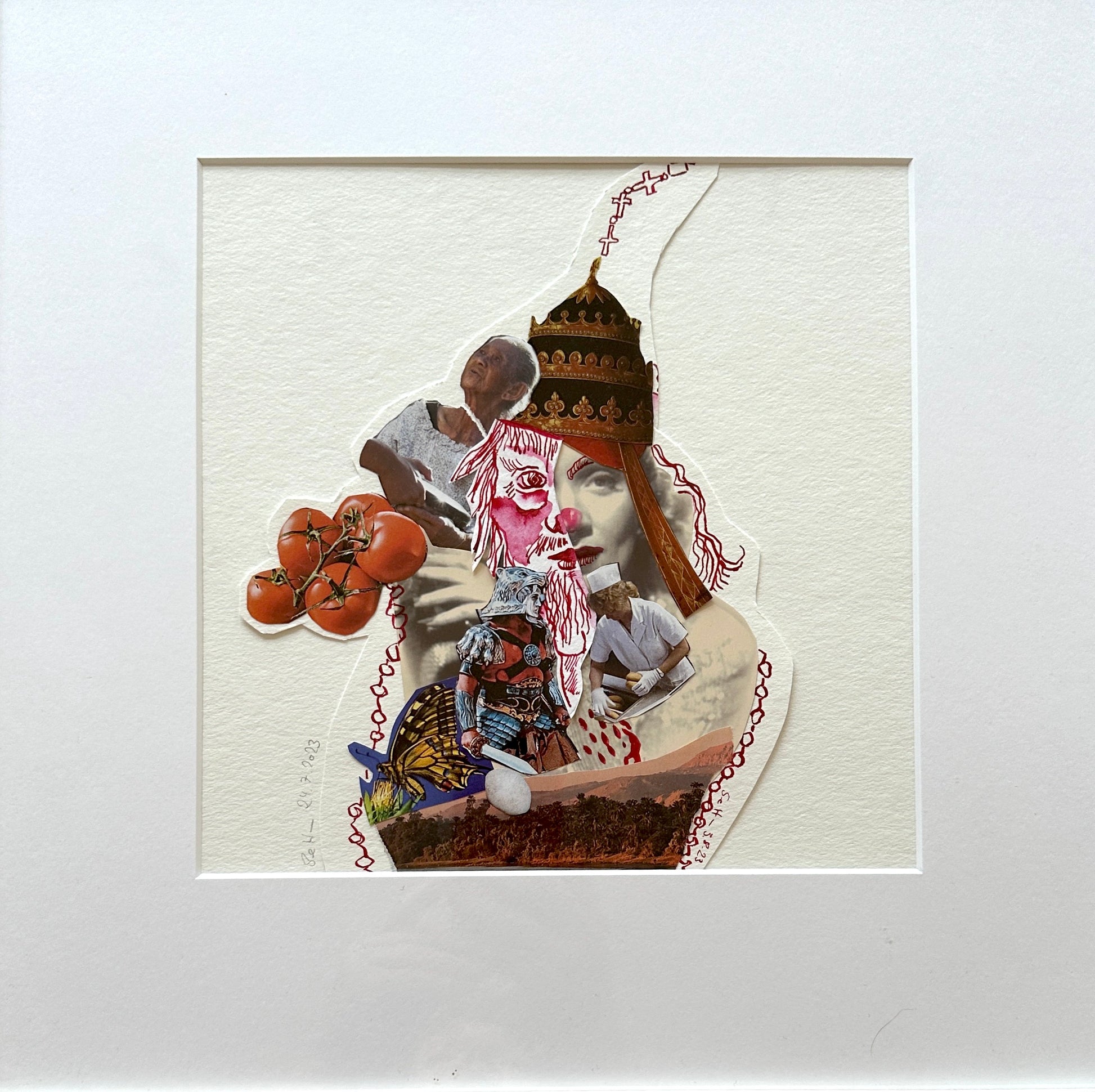 Die Collage ist im Passepartout in einem Rahmen der Größe 40 x 40 cm mit weißer Holzleiste hinter Glas gerahmt. Somit kann das Bild gleich gehangen werden.