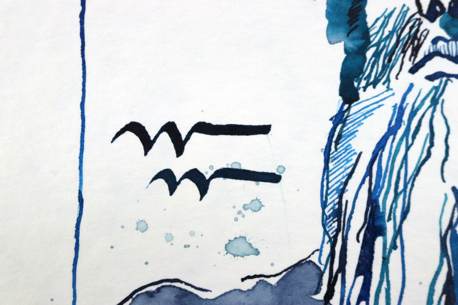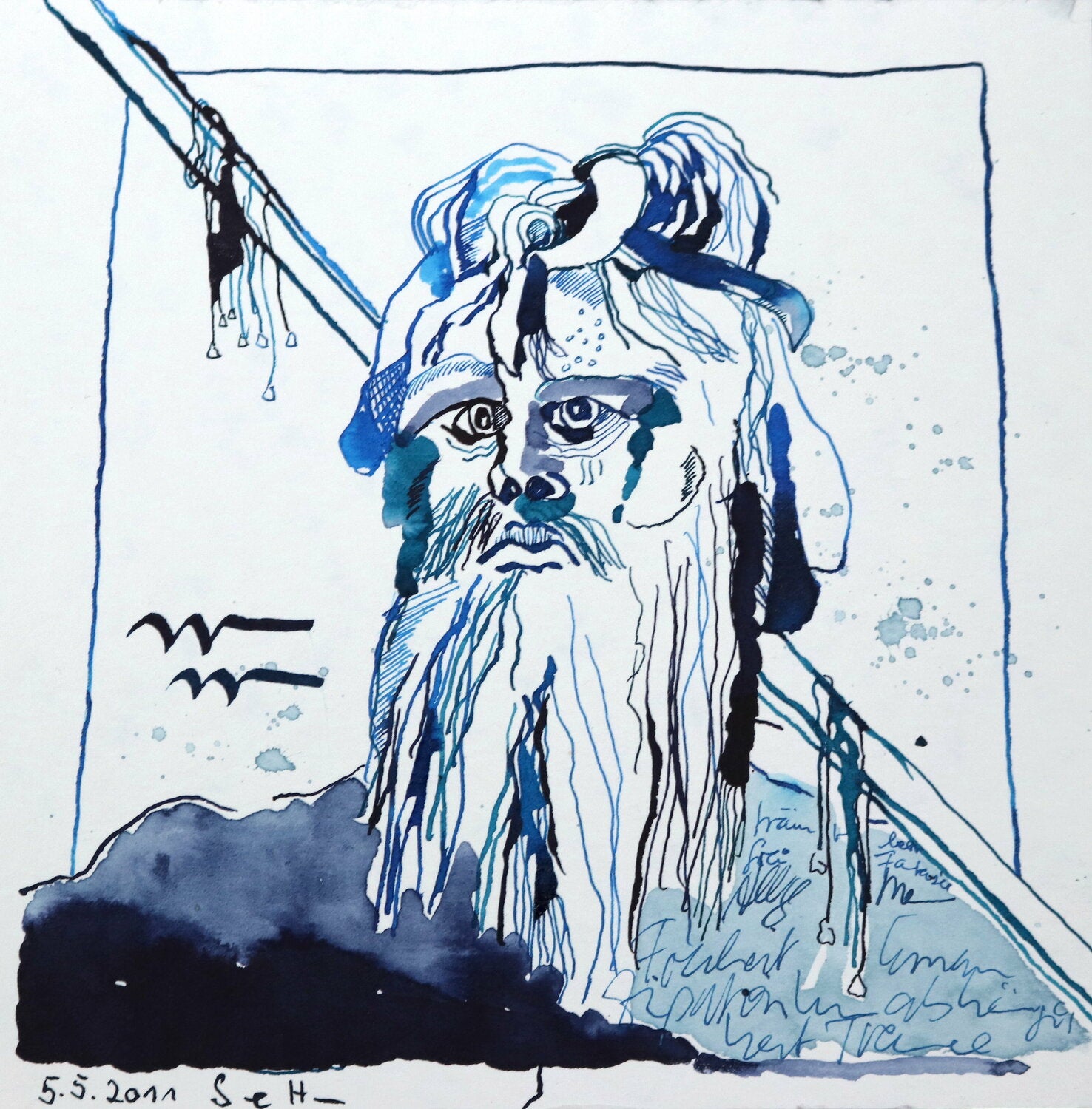 Ein Wassermann muss im Wasser schwimmen und so wählte Susanne Haun für ihren Wassermann Blautöne aus. Der Schütze ist kreativ und individuell. Auf Hauns Zeichnung ist die Kühle des Wassers ersichtlich. Wassermänner brauchen viel Freiraum für sich, den die Partnerin / der Partner gewähren sollte.