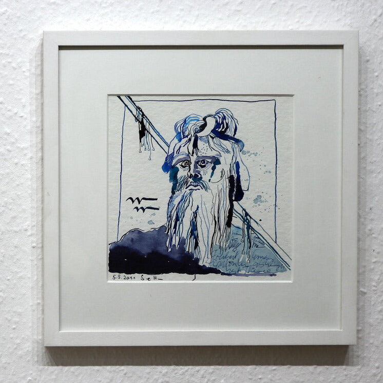 Die Zeichung ist in einem Rahmen mit weißer Holzleiste (Passepartout) in der Größe 30 x 30 cm gerahmt und kann sofort aufgehangen werden.