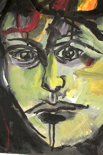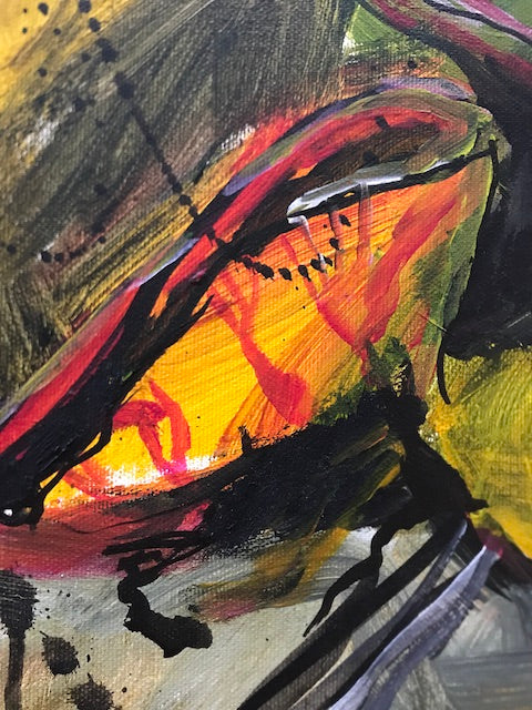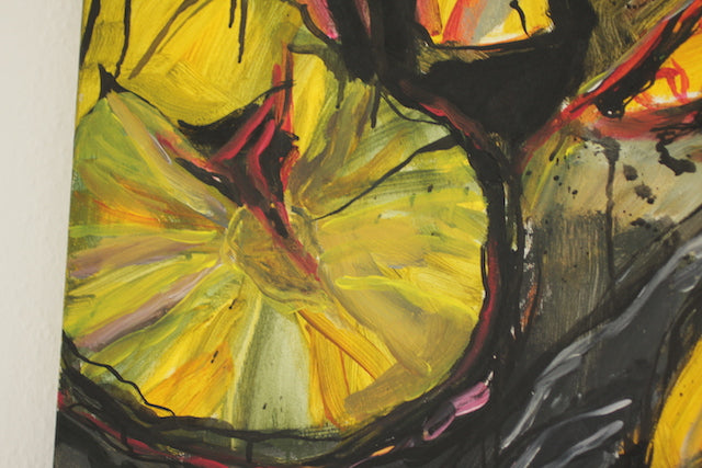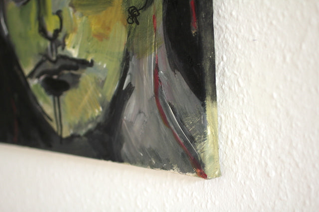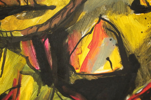 Außergewöhnlich für Haun ist die Materialwahl Öl, das sie gekonnt mit Tusche und Acryl kombiniert. Dadurch erhält das Gemälde einen satten Glanz auf der Oberfläche.