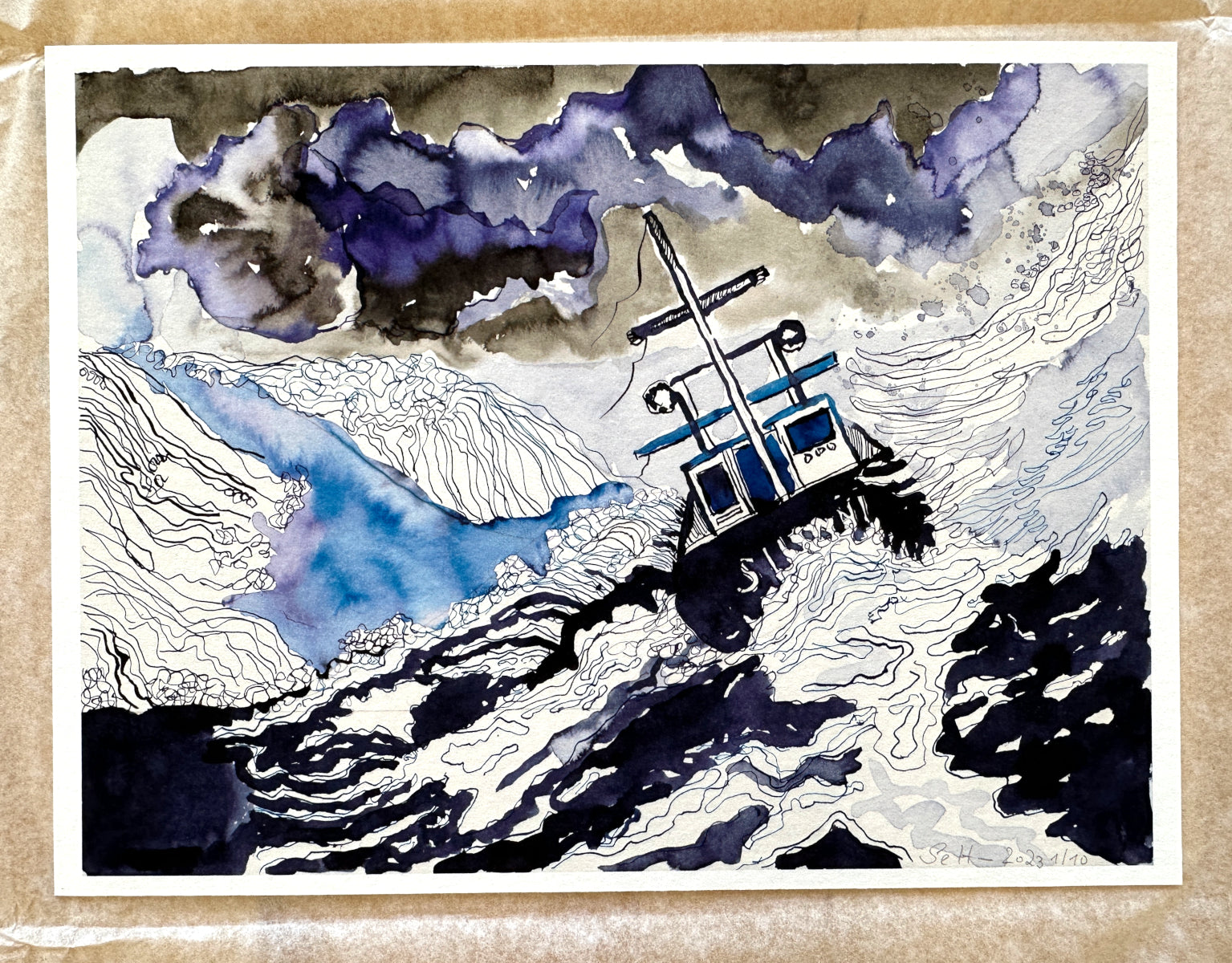 Kunstdruck der Zeichnung „Sturmwarnung“, Originalgröße 30 x 40 cm, mit Tusche auf Hahnemühle Aquarellkarton (Burgund) im Jahr 2021 gezeichnet von Susanne Haun.