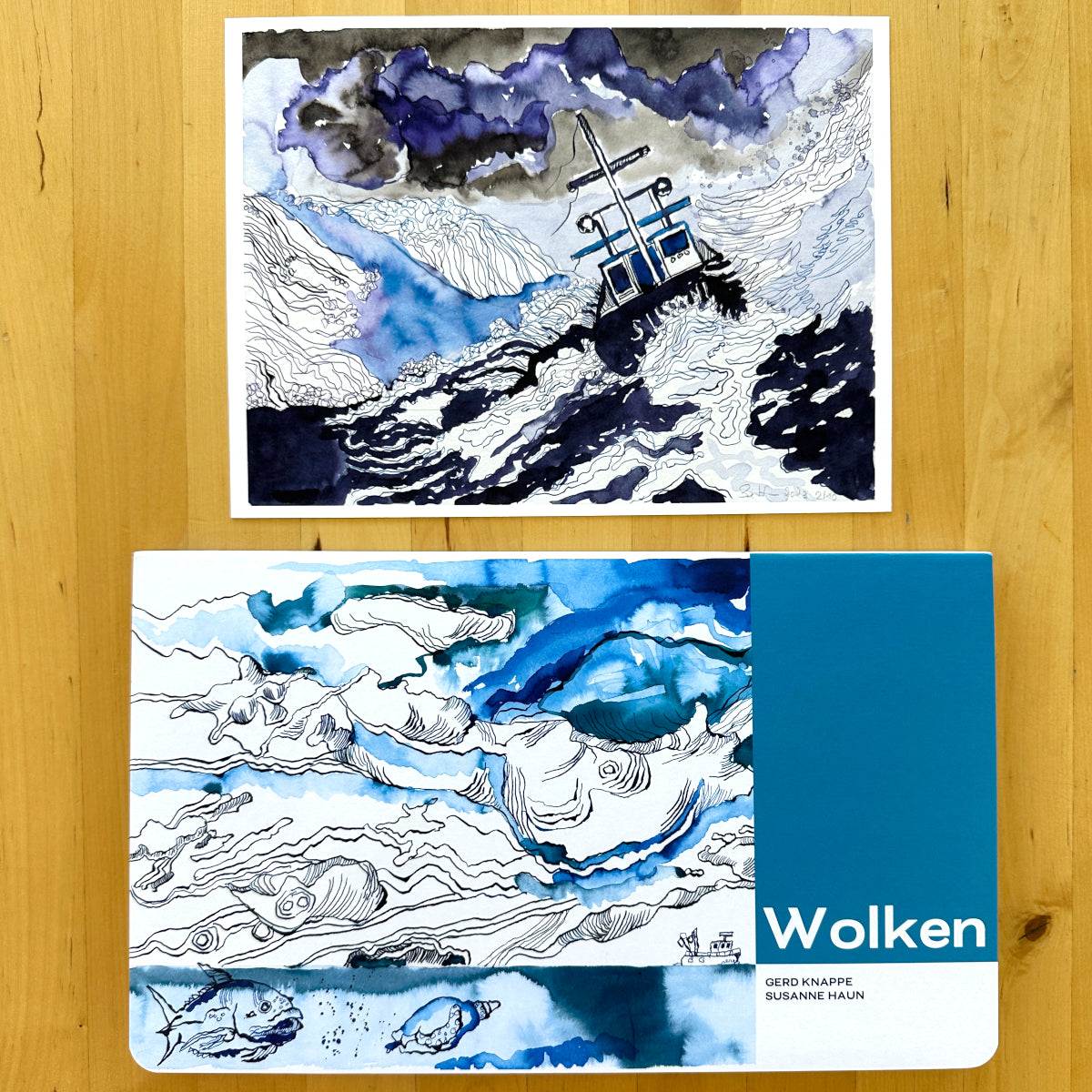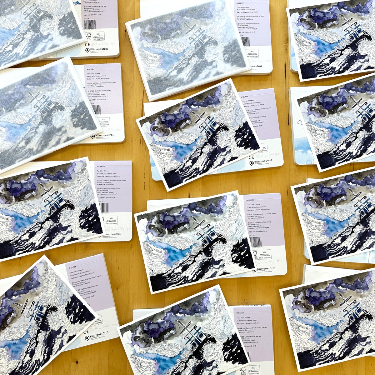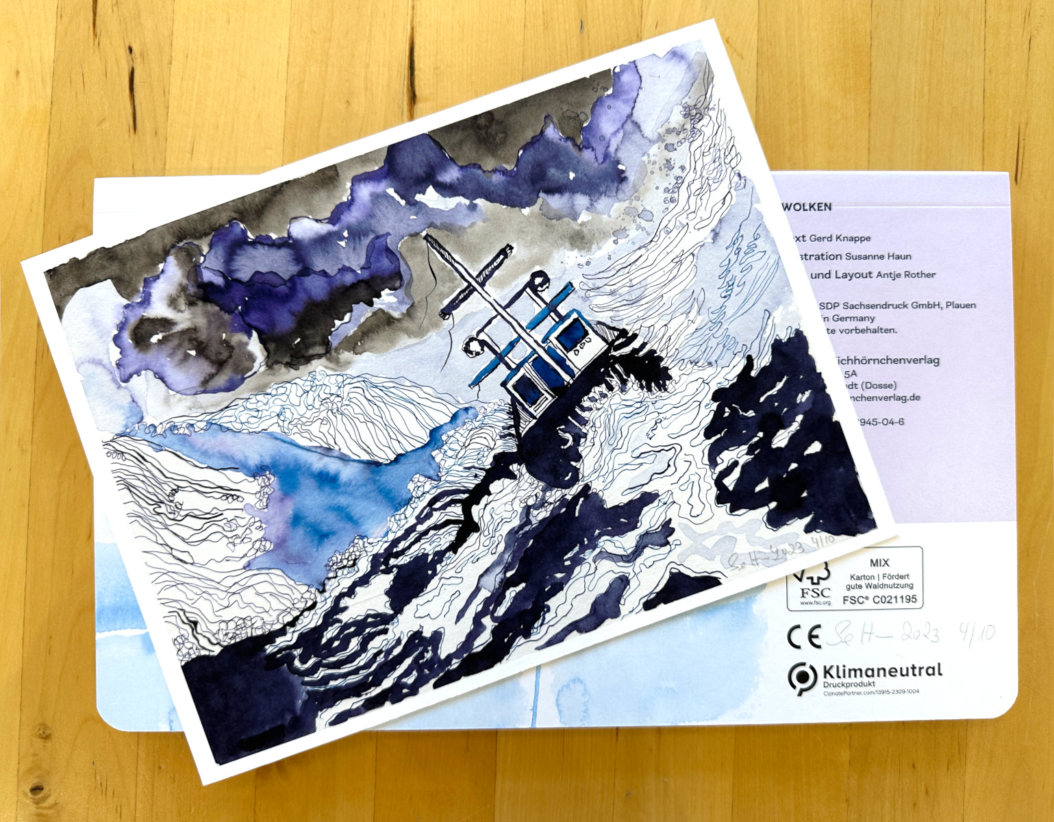 In der Edition wird die Zeichnung “Sturmwarnung” erstmalig und limitiert auf 10 Exemplare plus 2 e.a.* veröffentlicht. Den signierten Kunstdrucken in der Größe 17,8 x 24,0 cm auf Hahnemühle Museum Etching, 350 g von d’mage in Berlin gedruckt, ist je ein ebenfalls von Susanne Haun signiertes Exemplar des Bilderbuchs WOLKEN von Gerd Knappe und Susanne Haun beigegeben. Zusammen sind sie ein Schmaus für Augen und Seelen großer und kleiner Kunstliebhaber*innen, die gern den Blick in Höhen und Weiten schweifen lassen.
